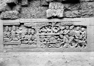 | Keywords: COLLECTIE TROPENMUSEUM Reliëf O 9 op de verborgen voet van de Borobudur TMnr 10015747.jpg nl Negatief Negatief waarop reliëf O 9 van de verborgen voet van de Borobudur te zien is De verborgen voet van de Borobudur is de oorspronkelijke basis van het Buddhistische heiligdom dat rond 800 gebouwd is In een latere fase van de bouw werd deze basis verborgen waarschijnlijk om verzakking te verkomen De verborgen voet loopt om het hele bouwwerk heen en bevat 160 reliëfs die tezamen de Mahakarmawibhangga verbeelden een Mahayanistische tekst die de werking van de leer van Karma uiteenzet Deze leerrede wordt aan Buddha toegeschreven en handelt over oorzaak en gevolg N J Krom en Th van Erp duiden in hun standaardwerk over de Borobudur Beschrijving van Barabudur Den Haag Martinus Nijhoff 1920-1931 de reliëfs van de verborgen voet aan als serie O Op de reliëfs zijn voorbeelden van de theorie uitgebeeld goede daden hebben goede gevolgen en slechte daden hebben slechte gevolgen De reliëfs vallen in twee delen uiteen O 1 tot en met O 117 verbeelden een aantal daden die leiden tot één en hetzelfde gevolg De reliëfs O 118 tot en met O 160 tonen verschillende gevolgen van één oorzaak De uiteenzetting van de leer begint bij de trap aan de oostzijde en ontrolt zich met de klok mee om het bouwwerk heen De reliëfs moeten dan ook gelezen worden van rechts naar links Lange tijd was onbekend wat op de reliëfs van de verborgen voet stond afgebeeld Hoewel de reliëfs al in 1885 waren ontdekt door Dr Ir J W IJzerman 1851-1932 kon de Franse geleerde Sylvain Lévi pas in 1929 op het zesde Congres van het Oostersch Genootschap constateren dat het op de verborgen voet ging om een Buddhistische tekst Mahakarmawibhangga Lévi had in 1922 een manuscript uit 1411 met deze tekst ontdekt in Kathmandu Nepal De tekst bleek populair in de Burdhistische wereld te zijn en een aantal verwante teksten te hebben twee Chinese werken waarvan één vertaald was in 582 door Gautama Dharmaprajna en één tussen 980 en 1000 door T'ien si Tsai Daarnaast bevat de Tibetaanse Kanjur twee werken met de titel Karmawibhangga In 1933 publiceerde de archeoloog N J Krom een uitgebreide analyse van het Mahakarmawibhangga op de reliëfs van de bedolven voet Hierin legt hij een relatie tussen de afbeeldingen op de reliëfs en de tekstpassages in het Mahakarmawibhangga Reliëf O 9 bevindt zich aan de oostzijde van de Borobudur en correspondeert volgens N J Krom met de tweede paragraaf van het Mahakarmawibhangga Wat is dan de daad die een lang leven ten gevolge heeft Antwoord het afzien van de aanslag op het leven; het prijzen van het afzien van de aanslag van het leven; het aanzetten daartoe; het prijzen daarvan; het vrijlaten van wezens die ter dood gedoemd zijn mensen vee varkens hanen enz ; het geven van veiligheid aan wezens in angst; de gedachte van mededogen temidden van verlaten wezens; de gedachte van welwillendheid temidden van uitgeputte wezens en ook van anderen kinderen en grijsaards; ook het geven van voedsel aan hen; de gedachte van welwillendheid voor degenen die de gave ontvangen Hetgeen hiervoor gezegd is van het aanschouwen van strijd enz in goede zin; ook het herstellen van vervallen stupa's caitya's en kloosters Dat is de daad die een lang leven ten gevolge heeft Uit N J Krom Het Karmawibhangga op Barabudur Mededeelingen der koninklijke academie van wetenschappen afdeeling letterkunde deel 76 serie B No 8 Amsterdam Noordhollandsche Uitgevers-Maatschappij 1933 220 Op reliëf O 9a is de vrijlating van dieren te zien Afgebeeld zijn varkens en hanen zoals die in de tekst genoemd worden Op het linkergedeelte is een aanzienlijke man te zien met zijn gezin en dienaren Dit is een manier om het lange leven uit te beelden Aan de rechterkant worden de goede daden getoond die daartoe hebben geleid De reliëfs O 6 tot en met O 12 laten de welwillendheid zien tegenover mensen die geschenken ontvangen Er is niets afgebeeld over het bekijken van een gevecht of het herstellen van heiligdommen uit de laatste zin van de tekst Bronnen A J Bernet Kempers Borobudur Mysteriegebeuren in steen Verval en restauratie Oudjavaans volksleven Wassenaar 1973/gewijzigde herdruk ; Van Erp Th Krom N J Beschrijving van Barabudur Den Haag Martinus Nijhoff 1920-1931 ; N J Krom Het Karmawibhangga op Barabudur Mededeelingen der koninklijke academie van wetenschappen afdeeling letterkunde deel 76 serie B No 8 Amsterdam Noordhollandsche Uitgevers-Maatschappij 1933 Reliëf O 9 op de verborgen voet van de Borobudur 1890-1891 institution Tropenmuseum KIT-source 10015747 Creator Kassian Cephas Borobudur in 1890 Black and white photographs |