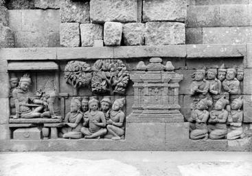 | Keywords: COLLECTIE TROPENMUSEUM Reliëf O 124 op de verborgen voet van de Borobudur TMnr 10015861.jpg nl Negatief Negatief waarop reliëf O 124 van de verborgen voet van de Borobudur te zien is De verborgen voet van de Borobudur is de oorspronkelijke basis van het Buddhistische heiligdom dat rond 800 gebouwd is In een latere fase van de bouw werd deze basis verborgen waarschijnlijk om verzakking te verkomen De verborgen voet loopt om het hele bouwwerk heen en bevat 160 reliëfs die tezamen de Mahakarmawibhangga verbeelden een Mahayanistische tekst die de werking van de leer van Karma uiteenzet Deze leerrede wordt aan Buddha toegeschreven en handelt over oorzaak en gevolg N J Krom en Th van Erp duiden in hun standaardwerk over de Borobudur Beschrijving van Barabudur Den Haag Martinus Nijhoff 1920-1931 de reliëfs van de verborgen voet aan als serie O Op de reliëfs zijn voorbeelden van de theorie uitgebeeld goede daden hebben goede gevolgen en slechte daden hebben slechte gevolgen De reliëfs vallen in twee delen uiteen O 1 tot en met O 117 verbeelden een aantal daden die leiden tot één en hetzelfde gevolg De reliëfs O 118 tot en met O 160 tonen verschillende gevolgen van één oorzaak De uiteenzetting van de leer begint bij de trap aan de oostzijde en ontrolt zich met de klok mee om het bouwwerk heen De reliëfs moeten dan ook gelezen worden van rechts naar links Lange tijd was onbekend wat op de reliëfs van de verborgen voet stond afgebeeld Hoewel de reliëfs al in 1885 waren ontdekt door Dr Ir J W IJzerman 1851-1932 kon de Franse geleerde Sylvain Lévi pas in 1929 op het zesde Congres van het Oostersch Genootschap constateren dat het op de verborgen voet ging om een Buddhistische tekst Mahakarmawibhangga Lévi had in 1922 een manuscript uit 1411 met deze tekst ontdekt in Kathmandu Nepal De tekst bleek populair in de Burdhistische wereld te zijn en een aantal verwante teksten te hebben twee Chinese werken waarvan één vertaald was in 582 door Gautama Dharmaprajna en één tussen 980 en 1000 door T'ien si Tsai Daarnaast bevat de Tibetaanse Kanjur twee werken met de titel Karmawibhangga In 1933 publiceerde de archeoloog N J Krom een uitgebreide analyse van het Mahakarmawibhangga op de reliëfs van de bedolven voet Hierin legt hij een relatie tussen de afbeeldingen op de reliëfs en de tekstpassages in het Mahakarmawibhangga Reliëf O 124 bevindt zich aan de noordzijde van de Borobudur en heeft volgens N J Krom betrekking op paragrafen 63 van het Mahakarmawibhangga LXIII Welke zijn de tien voordelen van het vereren van de heiligdommen van de Tathagata Antwoord men wordt schoon; men heeft een mooi geluid; men spreekt overtuigend; wanneer men in een gezelschap is gekomen wint men de genegenheid van het gezelschap; men is geliefd bij goden en mensen; men wordt een groot persoon; men heeft omgang met lieden die grote personen zijn; men heeft omgang met Buddha's en Buddha-hoorders; men heeft een rijke positie; men wordt herboren in de hemel; men bereikt spoedig het Parinirwana Dat zijn de tien voordelen van het vereren van de heiligdommen van de Tathagata Op O 124a zien we een aantal vereerders knielen en staan voor een tempelgebouwtje de inscriptie 'caityawandana' is het woord dat in de tekst gebruikt wordt voor een heiligdom De gevolgen van deze verdienstelijke daad zijn op O 124b O 125 en O 126 weergegeven De man die op O 124b in een paviljoen met een ander zit te praten onderscheidt zich door niets bijzonder maar is volgens de inscriptie 'suwarnawarna' goudkleurig Krom acht het waarschijnlijk dat het de bedoeling is geweest dat hij door de stuco-laag die ooit het monument bedekte ook daadwerkelijk goudkleurig leek Krom wijst erop dat 'suwarnawarna' niet in de tekst staat maar 'abhirupo' schoon De Franse oriëntalist en indologist Sylvain Lévi wijst erop dat goudkleurig wel in de Tibetaanse tekst voorkomt Onder het gevolg van de aanzienlijke man op O 125a bevinden zich muzikanten De inscriptie boven het reliëf luidt 'suswara' schoon van geluid Op O 125b zijn een paar rijk geklede mannen in gesprek volgens de inscriptie is dit een 'mahaujaskasamawadhana' een ontmoeting tussen grootmachtigen Op reliëf O 126a zien we een zeer rijke man met zijn gevolg Hij is 'bhogi' rijk gefortuneerd en heeft zelfs een aureool gekregen Hiermee is de beeldhouwer volgens Krom vooruit gelopen op het volgende tafereel waarboven de inscriptie 'swargga' hemel staat Dit tagereel is voorzien van een hemelboom juwelenpotten en kinnara's wezens die half mens half vogel zijn Een god met een aureool zit temidden van dienende vrouwen Uit N J Krom Het Karmawibhangga op Barabudur Mededeelingen der koninklijke academie van wetenschappen afdeeling letterkunde deel 76 serie B No 8 Amsterdam Noordhollandsche Uitgevers-Maatschappij 1933 259 Bronnen A J Bernet Kempers Borobudur Mysteriegebeuren in steen Verval en restauratie Oudjavaans volksleven Wassenaar 1973/gewijzigde herdruk ; Van Erp Th Krom N J Beschrijving van Barabudur Den Haag Martinus Nijhoff 1920-1931 ; N J Krom Het Karmawibhangga op Barabudur Mededeelingen der koninklijke academie van wetenschappen afdeeling letterkunde deel 76 serie B No 8 Amsterdam Noordhollandsche Uitgevers-Maatschappij 1933 Reliëf O 124 op de verborgen voet van de Borobudur 1890-1891 institution Tropenmuseum KIT-source 10015861 Creator Kassian Cephas Borobudur in 1890 Black and white photographs |