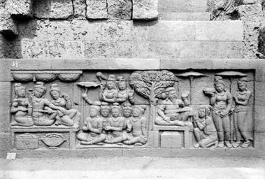 | Keywords: COLLECTIE TROPENMUSEUM Reliëf O 127 op de verborgen voet van de Borobudur TMnr 10015864.jpg nl Negatief Negatief waarop reliëf O 127 van de verborgen voet van de Borobudur te zien is De verborgen voet van de Borobudur is de oorspronkelijke basis van het Buddhistische heiligdom dat rond 800 gebouwd is In een latere fase van de bouw werd deze basis verborgen waarschijnlijk om verzakking te verkomen De verborgen voet loopt om het hele bouwwerk heen en bevat 160 reliëfs die tezamen de Mahakarmawibhangga verbeelden een Mahayanistische tekst die de werking van de leer van Karma uiteenzet Deze leerrede wordt aan Buddha toegeschreven en handelt over oorzaak en gevolg N J Krom en Th van Erp duiden in hun standaardwerk over de Borobudur Beschrijving van Barabudur Den Haag Martinus Nijhoff 1920-1931 de reliëfs van de verborgen voet aan als serie O Op de reliëfs zijn voorbeelden van de theorie uitgebeeld goede daden hebben goede gevolgen en slechte daden hebben slechte gevolgen De reliëfs vallen in twee delen uiteen O 1 tot en met O 117 verbeelden een aantal daden die leiden tot één en hetzelfde gevolg De reliëfs O 118 tot en met O 160 tonen verschillende gevolgen van één oorzaak De uiteenzetting van de leer begint bij de trap aan de oostzijde en ontrolt zich met de klok mee om het bouwwerk heen De reliëfs moeten dan ook gelezen worden van rechts naar links Lange tijd was onbekend wat op de reliëfs van de verborgen voet stond afgebeeld Hoewel de reliëfs al in 1885 waren ontdekt door Dr Ir J W IJzerman 1851-1932 kon de Franse geleerde Sylvain Lévi pas in 1929 op het zesde Congres van het Oostersch Genootschap constateren dat het op de verborgen voet ging om een Buddhistische tekst Mahakarmawibhangga Lévi had in 1922 een manuscript uit 1411 met deze tekst ontdekt in Kathmandu Nepal De tekst bleek populair in de Burdhistische wereld te zijn en een aantal verwante teksten te hebben twee Chinese werken waarvan één vertaald was in 582 door Gautama Dharmaprajna en één tussen 980 en 1000 door T'ien si Tsai Daarnaast bevat de Tibetaanse Kanjur twee werken met de titel Karmawibhangga In 1933 publiceerde de archeoloog N J Krom een uitgebreide analyse van het Mahakarmawibhangga op de reliëfs van de bedolven voet Hierin legt hij een relatie tussen de afbeeldingen op de reliëfs en de tekstpassages in het Mahakarmawibhangga Reliëf O 127 bevindt zich aan de noordzijde van de Borobudur en heeft volgens N J Krom betrekking op paragraaf 64 van het Mahakarmawibhangga LXIV Welke zijn de tien voordelen van de gift van een zonnescherm Antwoord men wordt het zonnescherm van de wereld; men heeft geen branding van het lichaam men heeft geen branding van de geest; alle daden die men doet om tot de heerschappij te raken hebben voorspoed; men wordt herhaaldelijk wereldbeheersende koning; men wordt een groot persoon; men heeft omgang met lieden die grote personen zijn; men heeft omgang met Buddha's en Buddha-hoorders; men heeft een rijke positie; men wordt herboren in de hemels; men bereikt spoedig het Parinirwana Hierbij verhaalt men enz Dit zijn de tien voordelen van de gift van een zonnescherm Deze paragraaf heeft betrekking op vier reliëfs O 127 tot en met O 130 Op reliëf O 127a knielt een man Hij is in het gezelschap van twee vrouwen en bevindt zich voor een zittende brahmaan Op de achtergrond staan twee zonneschermen De inscriptie boven het reliëf luidt chatradana' gift van een zonnescherm Boven O 127b staat de inscriptie nirupataptakayacitta ongebrand van lichaam en geest boven een aanzienlijke man in een paviljoen met zijn gezin en personneel Dit correspondeert met de tekst Het hele reliëf O 128 wordt gevuld door een gesprek van voorname lieden met hun gevolg en vrouwen Boven het reliëf is de inscriptie 'mahesakhyasamawadhana' ontmoeting met grote personen aangebracht Ook O 129 en O 130 tonen maar één tafereel Op O 129 is de wereldheerser te zien met de inscriptie 'cakrawartti'; hij is in het gezelschap van zijn gemalin olifant paard edelsteen en werprad tussen een talrijk gevolg Op O 130 is een hemel afgebeeld; een god met vrouwen dienaren en dienaressen een hemelboom juwelenpotten en kinnara's half mens half vogel Uit N J Krom Het Karmawibhangga op Barabudur Mededeelingen der koninklijke academie van wetenschappen afdeeling letterkunde deel 76 serie B No 8 Amsterdam Noordhollandsche Uitgevers-Maatschappij 1933 260-261 Bronnen A J Bernet Kempers Borobudur Mysteriegebeuren in steen Verval en restauratie Oudjavaans volksleven Wassenaar 1973/gewijzigde herdruk ; Van Erp Th Krom N J Beschrijving van Barabudur Den Haag Martinus Nijhoff 1920-1931 ; N J Krom Het Karmawibhangga op Barabudur Mededeelingen der koninklijke academie van wetenschappen afdeeling letterkunde deel 76 serie B No 8 Amsterdam Noordhollandsche Uitgevers-Maatschappij 1933 Reliëf O 127 op de verborgen voet van de Borobudur 1890-1891 institution Tropenmuseum KIT-source 10015864 Creator Kassian Cephas Borobudur in 1890 Black and white photographs |