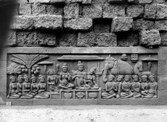 | Keywords: COLLECTIE TROPENMUSEUM Reliëf O 129 op de verborgen voet van de Borobudur TMnr 10015866.jpg nl Negatief Negatief waarop reliëf O 129 van de verborgen voet van de Borobudur te zien is De verborgen voet van de Borobudur is de oorspronkelijke basis van het Buddhistische heiligdom dat rond 800 gebouwd is In een latere fase van de bouw werd deze basis verborgen waarschijnlijk om verzakking te verkomen De verborgen voet loopt om het hele bouwwerk heen en bevat 160 reliëfs die tezamen de Mahakarmawibhangga verbeelden een Mahayanistische tekst die de werking van de leer van Karma uiteenzet Deze leerrede wordt aan Buddha toegeschreven en handelt over oorzaak en gevolg N J Krom en Th van Erp duiden in hun standaardwerk over de Borobudur Beschrijving van Barabudur Den Haag Martinus Nijhoff 1920-1931 de reliëfs van de verborgen voet aan als serie O Op de reliëfs zijn voorbeelden van de theorie uitgebeeld goede daden hebben goede gevolgen en slechte daden hebben slechte gevolgen De reliëfs vallen in twee delen uiteen O 1 tot en met O 117 verbeelden een aantal daden die leiden tot één en hetzelfde gevolg De reliëfs O 118 tot en met O 160 tonen verschillende gevolgen van één oorzaak De uiteenzetting van de leer begint bij de trap aan de oostzijde en ontrolt zich met de klok mee om het bouwwerk heen De reliëfs moeten dan ook gelezen worden van rechts naar links Lange tijd was onbekend wat op de reliëfs van de verborgen voet stond afgebeeld Hoewel de reliëfs al in 1885 waren ontdekt door Dr Ir J W IJzerman 1851-1932 kon de Franse geleerde Sylvain Lévi pas in 1929 op het zesde Congres van het Oostersch Genootschap constateren dat het op de verborgen voet ging om een Buddhistische tekst Mahakarmawibhangga Lévi had in 1922 een manuscript uit 1411 met deze tekst ontdekt in Kathmandu Nepal De tekst bleek populair in de Burdhistische wereld te zijn en een aantal verwante teksten te hebben twee Chinese werken waarvan één vertaald was in 582 door Gautama Dharmaprajna en één tussen 980 en 1000 door T'ien si Tsai Daarnaast bevat de Tibetaanse Kanjur twee werken met de titel Karmawibhangga In 1933 publiceerde de archeoloog N J Krom een uitgebreide analyse van het Mahakarmawibhangga op de reliëfs van de bedolven voet Hierin legt hij een relatie tussen de afbeeldingen op de reliëfs en de tekstpassages in het Mahakarmawibhangga Reliëf O 129 bevindt zich aan de noordzijde van de Borobudur en heeft volgens N J Krom betrekking op paragraaf 64 van het Mahakarmawibhangga LXIV Welke zijn de tien voordelen van de gift van een zonnescherm Antwoord men wordt het zonnescherm van de wereld; men heeft geen branding van het lichaam men heeft geen branding van de geest; alle daden die men doet om tot de heerschappij te raken hebben voorspoed; men wordt herhaaldelijk wereldbeheersende koning; men wordt een groot persoon; men heeft omgang met lieden die grote personen zijn; men heeft omgang met Buddha's en Buddha-hoorders; men heeft een rijke positie; men wordt herboren in de hemels; men bereikt spoedig het Parinirwana Hierbij verhaalt men enz Dit zijn de tien voordelen van de gift van een zonnescherm Deze paragraaf heeft betrekking op vier reliëfs O 127 tot en met O 130 Op reliëf O 127a knielt een man Hij is in het gezelschap van twee vrouwen en bevindt zich voor een zittende brahmaan Op de achtergrond staan twee zonneschermen De inscriptie boven het reliëf luidt chatradana' gift van een zonnescherm Boven O 127b staat de inscriptie nirupataptakayacitta ongebrand van lichaam en geest boven een aanzienlijke man in een paviljoen met zijn gezin en personneel Dit correspondeert met de tekst Het hele reliëf O 128 wordt gevuld door een gesprek van voorname lieden met hun gevolg en vrouwen Boven het reliëf is de inscriptie 'mahesakhyasamawadhana' ontmoeting met grote personen aangebracht Ook O 129 en O 130 tonen maar één tafereel Op O 129 is de wereldheerser te zien met de inscriptie 'cakrawartti'; hij is in het gezelschap van zijn gemalin olifant paard edelsteen en werprad tussen een talrijk gevolg Op O 130 is een hemel afgebeeld; een god met vrouwen dienaren en dienaressen een hemelboom juwelenpotten en kinnara's half mens half vogel Uit N J Krom Het Karmawibhangga op Barabudur Mededeelingen der koninklijke academie van wetenschappen afdeeling letterkunde deel 76 serie B No 8 Amsterdam Noordhollandsche Uitgevers-Maatschappij 1933 260-261 Bronnen A J Bernet Kempers Borobudur Mysteriegebeuren in steen Verval en restauratie Oudjavaans volksleven Wassenaar 1973/gewijzigde herdruk ; Van Erp Th Krom N J Beschrijving van Barabudur Den Haag Martinus Nijhoff 1920-1931 ; N J Krom Het Karmawibhangga op Barabudur Mededeelingen der koninklijke academie van wetenschappen afdeeling letterkunde deel 76 serie B No 8 Amsterdam Noordhollandsche Uitgevers-Maatschappij 1933 Reliëf O 129 op de verborgen voet van de Borobudur 1890-1891 institution Tropenmuseum KIT-source 10015866 Creator Kassian Cephas Borobudur in 1890 Black and white photographs |