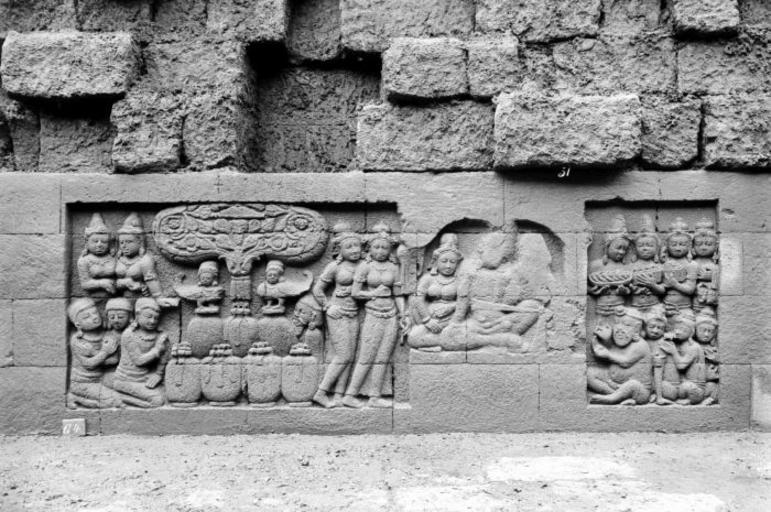 | Keywords: COLLECTIE TROPENMUSEUM Reliëf O 130 op de verborgen voet van de Borobudur TMnr 10015867.jpg nl Negatief Negatief waarop reliëf O 130 van de verborgen voet van de Borobudur te zien is De verborgen voet van de Borobudur is de oorspronkelijke basis van het Buddhistische heiligdom dat rond 800 gebouwd is In een latere fase van de bouw werd deze basis verborgen waarschijnlijk om verzakking te verkomen De verborgen voet loopt om het hele bouwwerk heen en bevat 160 reliëfs die tezamen de Mahakarmawibhangga verbeelden een Mahayanistische tekst die de werking van de leer van Karma uiteenzet Deze leerrede wordt aan Buddha toegeschreven en handelt over oorzaak en gevolg N J Krom en Th van Erp duiden in hun standaardwerk over de Borobudur Beschrijving van Barabudur Den Haag Martinus Nijhoff 1920-1931 de reliëfs van de verborgen voet aan als serie O Op de reliëfs zijn voorbeelden van de theorie uitgebeeld goede daden hebben goede gevolgen en slechte daden hebben slechte gevolgen De reliëfs vallen in twee delen uiteen O 1 tot en met O 117 verbeelden een aantal daden die leiden tot één en hetzelfde gevolg De reliëfs O 118 tot en met O 160 tonen verschillende gevolgen van één oorzaak De uiteenzetting van de leer begint bij de trap aan de oostzijde en ontrolt zich met de klok mee om het bouwwerk heen De reliëfs moeten dan ook gelezen worden van rechts naar links Lange tijd was onbekend wat op de reliëfs van de verborgen voet stond afgebeeld Hoewel de reliëfs al in 1885 waren ontdekt door Dr Ir J W IJzerman 1851-1932 kon de Franse geleerde Sylvain Lévi pas in 1929 op het zesde Congres van het Oostersch Genootschap constateren dat het op de verborgen voet ging om een Buddhistische tekst Mahakarmawibhangga Lévi had in 1922 een manuscript uit 1411 met deze tekst ontdekt in Kathmandu Nepal De tekst bleek populair in de Burdhistische wereld te zijn en een aantal verwante teksten te hebben twee Chinese werken waarvan één vertaald was in 582 door Gautama Dharmaprajna en één tussen 980 en 1000 door T'ien si Tsai Daarnaast bevat de Tibetaanse Kanjur twee werken met de titel Karmawibhangga In 1933 publiceerde de archeoloog N J Krom een uitgebreide analyse van het Mahakarmawibhangga op de reliëfs van de bedolven voet Hierin legt hij een relatie tussen de afbeeldingen op de reliëfs en de tekstpassages in het Mahakarmawibhangga Reliëf O 130 bevindt zich aan de noordzijde van de Borobudur en heeft volgens N J Krom betrekking op paragraaf 64 van het Mahakarmawibhangga LXIV Welke zijn de tien voordelen van de gift van een zonnescherm Antwoord men wordt het zonnescherm van de wereld; men heeft geen branding van het lichaam men heeft geen branding van de geest; alle daden die men doet om tot de heerschappij te raken hebben voorspoed; men wordt herhaaldelijk wereldbeheersende koning; men wordt een groot persoon; men heeft omgang met lieden die grote personen zijn; men heeft omgang met Buddha's en Buddha-hoorders; men heeft een rijke positie; men wordt herboren in de hemels; men bereikt spoedig het Parinirwana Hierbij verhaalt men enz Dit zijn de tien voordelen van de gift van een zonnescherm Deze paragraaf heeft betrekking op vier reliëfs O 127 tot en met O 130 Op reliëf O 127a knielt een man Hij is in het gezelschap van twee vrouwen en bevindt zich voor een zittende brahmaan Op de achtergrond staan twee zonneschermen De inscriptie boven het reliëf luidt chatradana' gift van een zonnescherm Boven O 127b staat de inscriptie nirupataptakayacitta ongebrand van lichaam en geest boven een aanzienlijke man in een paviljoen met zijn gezin en personneel Dit correspondeert met de tekst Het hele reliëf O 128 wordt gevuld door een gesprek van voorname lieden met hun gevolg en vrouwen Boven het reliëf is de inscriptie 'mahesakhyasamawadhana' ontmoeting met grote personen aangebracht Ook O 129 en O 130 tonen maar één tafereel Op O 129 is de wereldheerser te zien met de inscriptie 'cakrawartti'; hij is in het gezelschap van zijn gemalin olifant paard edelsteen en werprad tussen een talrijk gevolg Op O 130 is een hemel afgebeeld; een god met vrouwen dienaren en dienaressen een hemelboom juwelenpotten en kinnara's half mens half vogel Uit N J Krom Het Karmawibhangga op Barabudur Mededeelingen der koninklijke academie van wetenschappen afdeeling letterkunde deel 76 serie B No 8 Amsterdam Noordhollandsche Uitgevers-Maatschappij 1933 260-261 Bronnen A J Bernet Kempers Borobudur Mysteriegebeuren in steen Verval en restauratie Oudjavaans volksleven Wassenaar 1973/gewijzigde herdruk ; Van Erp Th Krom N J Beschrijving van Barabudur Den Haag Martinus Nijhoff 1920-1931 ; N J Krom Het Karmawibhangga op Barabudur Mededeelingen der koninklijke academie van wetenschappen afdeeling letterkunde deel 76 serie B No 8 Amsterdam Noordhollandsche Uitgevers-Maatschappij 1933 Reliëf O 130 op de verborgen voet van de Borobudur 1890-1891 institution Tropenmuseum KIT-source 10015867 Creator Kassian Cephas Borobudur in 1890 Black and white photographs |