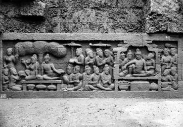 | Keywords: COLLECTIE TROPENMUSEUM Reliëf O 134 op de verborgen voet van de Borobudur TMnr 10015871.jpg nl Negatief Negatief waarop reliëf O 134 van de verborgen voet van de Borobudur te zien is De verborgen voet van de Borobudur is de oorspronkelijke basis van het Buddhistische heiligdom dat rond 800 gebouwd is In een latere fase van de bouw werd deze basis verborgen waarschijnlijk om verzakking te verkomen De verborgen voet loopt om het hele bouwwerk heen en bevat 160 reliëfs die tezamen de Mahakarmawibhangga verbeelden een Mahayanistische tekst die de werking van de leer van Karma uiteenzet Deze leerrede wordt aan Buddha toegeschreven en handelt over oorzaak en gevolg N J Krom en Th van Erp duiden in hun standaardwerk over de Borobudur Beschrijving van Barabudur Den Haag Martinus Nijhoff 1920-1931 de reliëfs van de verborgen voet aan als serie O Op de reliëfs zijn voorbeelden van de theorie uitgebeeld goede daden hebben goede gevolgen en slechte daden hebben slechte gevolgen De reliëfs vallen in twee delen uiteen O 1 tot en met O 117 verbeelden een aantal daden die leiden tot één en hetzelfde gevolg De reliëfs O 118 tot en met O 160 tonen verschillende gevolgen van één oorzaak De uiteenzetting van de leer begint bij de trap aan de oostzijde en ontrolt zich met de klok mee om het bouwwerk heen De reliëfs moeten dan ook gelezen worden van rechts naar links Lange tijd was onbekend wat op de reliëfs van de verborgen voet stond afgebeeld Hoewel de reliëfs al in 1885 waren ontdekt door Dr Ir J W IJzerman 1851-1932 kon de Franse geleerde Sylvain Lévi pas in 1929 op het zesde Congres van het Oostersch Genootschap constateren dat het op de verborgen voet ging om een Buddhistische tekst Mahakarmawibhangga Lévi had in 1922 een manuscript uit 1411 met deze tekst ontdekt in Kathmandu Nepal De tekst bleek populair in de Burdhistische wereld te zijn en een aantal verwante teksten te hebben twee Chinese werken waarvan één vertaald was in 582 door Gautama Dharmaprajna en één tussen 980 en 1000 door T'ien si Tsai Daarnaast bevat de Tibetaanse Kanjur twee werken met de titel Karmawibhangga In 1933 publiceerde de archeoloog N J Krom een uitgebreide analyse van het Mahakarmawibhangga op de reliëfs van de bedolven voet Hierin legt hij een relatie tussen de afbeeldingen op de reliëfs en de tekstpassages in het Mahakarmawibhangga Reliëf O 134 bevindt zich aan de noordzijde van de Borobudur en heeft volgens N J Krom betrekking op paragraaf 65 van het Mahakarmawibhangga LXV Welke zijn de tien voordelen van de gift van een klok Antwoord men wordt schoon; men heeft een mooi geluid; men heeft een lieflijke stem; men heeft een stem als het gezang van de kalawingka-vogel; men spreekt overtuigend; men is altijd geneigd tot tevredenheid; men hoort steeds weer een heerlijk geluid; men wordt herboren in de hemels; men heeft een rijke positie; men bereikt spoedig het Parinirwana Zoals Dit zijn de tien voordelen van de gift van een klok Deze paragraaf heeft betrekking op de reliëfs O 131 tot en met O 134 Op O 131a is de klok te zien die aan een rek hangt; eronder staan en knielen vereerders Zij geven de klok als geschenk aan een heiligdom dat links staat Boven dit reliëf staat de inscriptie 'ghanta' hangt op 131a aan een rek Reliëf O 131b toont een paviljoen aanzienlijke mannen een gesprek voeren Daarboven lezen wij de inscriptie 'mahesakyasamawadhana' Op O 132 is de wereldheerser afgebeeld en het opschrift 'cakrawarti' Een aanzienlijke man zit met een ander te praten op O 133a Dit tafereel heeft geen inscriptie maar volgens Krom lijkt het erop dat hij een grote persoon is Op O 133b is weer een aanzienlijke man met volgelingen afgebeeld Opmerkelijk is volgens Krom de inscriptie 'sabdasrawana' horen van een geluid wat klopt met de tekst maar waarvan het onduidelijk is wat eraan vooraf gaat Op O 134a zien wij een aanzienlijke man in zijn paviljoen met de inscriptie 'bhogi' rijk gefortuneerd en op O 134b de hemel Onder een boom zitten daar een mannen- en een vrouwenfiguur temidden van hun gevolg De inscriptie 'swargga' hemel geeft duidelijkheid Uit N J Krom Het Karmawibhangga op Barabudur Mededeelingen der koninklijke academie van wetenschappen afdeeling letterkunde deel 76 serie B No 8 Amsterdam Noordhollandsche Uitgevers-Maatschappij 1933 261-263 Bronnen A J Bernet Kempers Borobudur Mysteriegebeuren in steen Verval en restauratie Oudjavaans volksleven Wassenaar 1973/gewijzigde herdruk ; Van Erp Th Krom N J Beschrijving van Barabudur Den Haag Martinus Nijhoff 1920-1931 ; N J Krom Het Karmawibhangga op Barabudur Mededeelingen der koninklijke academie van wetenschappen afdeeling letterkunde deel 76 serie B No 8 Amsterdam Noordhollandsche Uitgevers-Maatschappij 1933 Reliëf O 134 op de verborgen voet van de Borobudur 1890-1891 institution Tropenmuseum KIT-source 10015871 Creator Kassian Cephas Borobudur in 1890 Black and white photographs |