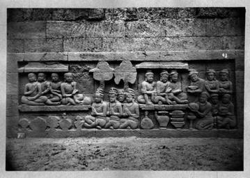 | Keywords: COLLECTIE TROPENMUSEUM Reliëf O 138 op de verborgen voet van de Borobudur TMnr 10015875.jpg nl Negatief Negatief waarop reliëf O 138 van de verborgen voet van de Borobudur te zien is De verborgen voet van de Borobudur is de oorspronkelijke basis van het Buddhistische heiligdom dat rond 800 gebouwd is In een latere fase van de bouw werd deze basis verborgen waarschijnlijk om verzakking te verkomen De verborgen voet loopt om het hele bouwwerk heen en bevat 160 reliëfs die tezamen de Mahakarmawibhangga verbeelden een Mahayanistische tekst die de werking van de leer van Karma uiteenzet Deze leerrede wordt aan Buddha toegeschreven en handelt over oorzaak en gevolg N J Krom en Th van Erp duiden in hun standaardwerk over de Borobudur Beschrijving van Barabudur Den Haag Martinus Nijhoff 1920-1931 de reliëfs van de verborgen voet aan als serie O Op de reliëfs zijn voorbeelden van de theorie uitgebeeld goede daden hebben goede gevolgen en slechte daden hebben slechte gevolgen De reliëfs vallen in twee delen uiteen O 1 tot en met O 117 verbeelden een aantal daden die leiden tot één en hetzelfde gevolg De reliëfs O 118 tot en met O 160 tonen verschillende gevolgen van één oorzaak De uiteenzetting van de leer begint bij de trap aan de oostzijde en ontrolt zich met de klok mee om het bouwwerk heen De reliëfs moeten dan ook gelezen worden van rechts naar links Lange tijd was onbekend wat op de reliëfs van de verborgen voet stond afgebeeld Hoewel de reliëfs al in 1885 waren ontdekt door Dr Ir J W IJzerman 1851-1932 kon de Franse geleerde Sylvain Lévi pas in 1929 op het zesde Congres van het Oostersch Genootschap constateren dat het op de verborgen voet ging om een Buddhistische tekst Mahakarmawibhangga Lévi had in 1922 een manuscript uit 1411 met deze tekst ontdekt in Kathmandu Nepal De tekst bleek populair in de Burdhistische wereld te zijn en een aantal verwante teksten te hebben twee Chinese werken waarvan één vertaald was in 582 door Gautama Dharmaprajna en één tussen 980 en 1000 door T'ien si Tsai Daarnaast bevat de Tibetaanse Kanjur twee werken met de titel Karmawibhangga In 1933 publiceerde de archeoloog N J Krom een uitgebreide analyse van het Mahakarmawibhangga op de reliëfs van de bedolven voet Hierin legt hij een relatie tussen de afbeeldingen op de reliëfs en de tekstpassages in het Mahakarmawibhangga Reliëf O 138 bevindt zich aan de noordzijde van de Borobudur en heeft volgens N J Krom betrekking op paragraaf 68 van het Mahakarmawibhangga LXVIII Welke zijn de tien voordelen van de gift van vaatwerk Antwoord men wordt een vat van deugden; men wordt glad van denkvermogen; men lijdt niet veel dorst; als men dorst heeft verschijnt er water; men wordt niet herboren bij preta's; men heeft nooit gebrek aan vaatwerk; men heeft een rijke positie; men wordt herboren in de hemels; men bereikt spoedig het Parinirwana Dit zijn de tien voordelen van de gift van vaatwerk Deze paragraaf heeft betrekking op reliëfs O 138 tot en met O 140 Boven O 138a staat een inscriptie waarvan slechts het einde te lezen is 'dana' Op het reliëf staan staande en knielende personen afgebeeld die schalen aanbieden aan drie personen onder een afdak Op het volgende tafereel op O 138b bezoeken vier mannen vier hoger geplaatste monniken Hier staat de inscriptie 'kusaladharmabhajana' vaten van voortreffelijke eigenschappen wat overeenkomt met de vaten van deugden in de tekst Reliëf O 139 bevat één tafereel van een rijke man met kostbaarheden onder zijn zetel en zijn talrijke gevolg De inscriptie luidt 'bhogi' rijk gefortuneerd Op O 140a zien we een aanzienlijke rijke man met zijn vrouwen in een paviljoen Op O 140b zien we een rijke man naast een heiligdom De inscriptie 'swargga' geeft aan dat het om een hemel gaat ook al ontbreken hier de hemelboom de juwelenpotten en de kinnara's half mens half vogel die normaliter een hemel aanduiden Uit N J Krom Het Karmawibhangga op Barabudur Mededeelingen der koninklijke academie van wetenschappen afdeeling letterkunde deel 76 serie B No 8 Amsterdam Noordhollandsche Uitgevers-Maatschappij 1933 263-264 Bronnen A J Bernet Kempers Borobudur Mysteriegebeuren in steen Verval en restauratie Oudjavaans volksleven Wassenaar 1973/gewijzigde herdruk ; Van Erp Th Krom N J Beschrijving van Barabudur Den Haag Martinus Nijhoff 1920-1931 ; N J Krom Het Karmawibhangga op Barabudur Mededeelingen der koninklijke academie van wetenschappen afdeeling letterkunde deel 76 serie B No 8 Amsterdam Noordhollandsche Uitgevers-Maatschappij 1933 Reliëf O 138 op de verborgen voet van de Borobudur 1890-1891 institution Tropenmuseum KIT-source 10015875 Creator Kassian Cephas Borobudur in 1890 Black and white photographs |