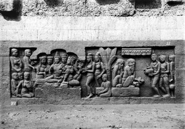 | Keywords: COLLECTIE TROPENMUSEUM Reliëf O 148 op de verborgen voet van de Borobudur TMnr 10015884.jpg nl Negatief Negatief waarop reliëf O 148 van de verborgen voet van de Borobudur te zien is De verborgen voet van de Borobudur is de oorspronkelijke basis van het Buddhistische heiligdom dat rond 800 gebouwd is In een latere fase van de bouw werd deze basis verborgen waarschijnlijk om verzakking te verkomen De verborgen voet loopt om het hele bouwwerk heen en bevat 160 reliëfs die tezamen de Mahakarmawibhangga verbeelden een Mahayanistische tekst die de werking van de leer van Karma uiteenzet Deze leerrede wordt aan Buddha toegeschreven en handelt over oorzaak en gevolg N J Krom en Th van Erp duiden in hun standaardwerk over de Borobudur Beschrijving van Barabudur Den Haag Martinus Nijhoff 1920-1931 de reliëfs van de verborgen voet aan als serie O Op de reliëfs zijn voorbeelden van de theorie uitgebeeld goede daden hebben goede gevolgen en slechte daden hebben slechte gevolgen De reliëfs vallen in twee delen uiteen O 1 tot en met O 117 verbeelden een aantal daden die leiden tot één en hetzelfde gevolg De reliëfs O 118 tot en met O 160 tonen verschillende gevolgen van één oorzaak De uiteenzetting van de leer begint bij de trap aan de oostzijde en ontrolt zich met de klok mee om het bouwwerk heen De reliëfs moeten dan ook gelezen worden van rechts naar links Lange tijd was onbekend wat op de reliëfs van de verborgen voet stond afgebeeld Hoewel de reliëfs al in 1885 waren ontdekt door Dr Ir J W IJzerman 1851-1932 kon de Franse geleerde Sylvain Lévi pas in 1929 op het zesde Congres van het Oostersch Genootschap constateren dat het op de verborgen voet ging om een Buddhistische tekst Mahakarmawibhangga Lévi had in 1922 een manuscript uit 1411 met deze tekst ontdekt in Kathmandu Nepal De tekst bleek populair in de Burdhistische wereld te zijn en een aantal verwante teksten te hebben twee Chinese werken waarvan één vertaald was in 582 door Gautama Dharmaprajna en één tussen 980 en 1000 door T'ien si Tsai Daarnaast bevat de Tibetaanse Kanjur twee werken met de titel Karmawibhangga In 1933 publiceerde de archeoloog N J Krom een uitgebreide analyse van het Mahakarmawibhangga op de reliëfs van de bedolven voet Hierin legt hij een relatie tussen de afbeeldingen op de reliëfs en de tekstpassages in het Mahakarmawibhangga Reliëf O 148 bevindt zich aan de oostzijde van de Borobudur en heeft volgens N J Krom betrekking op paragraaf 69 van het Mahakarmawibhangga LXXII Welke zijn de tien goede eigenschappen van de gift van drinken Antwoord men heeft al zijn organen volledig; men is rustig van gelaat; men is rein van voorhoofd; men is zacht van huis; men redeneert goed samenhangend; men lijdt niet veel dorst; als men dorst heeft verschijnt er water; men wordt niet herboren onder preta's; men heeft een rijke positie; men wordt herboren in hemels; men bereikt spoedig het Parinirwana Zoals enz Dit zijn de tien goede eigenschappen van de gift van drinken Deze paragraaf heeft betrekking op reliëfs O 148 en O 149 Boven reliëf O 148a staat de inscriptie 'pana ka ' drinken We zien een aantal zittende mensen die water ingeschonken krijgen uit een vaas met een tuit Op O 148b laat een rijke man met zijn gezin en personeel zien Reliëf O 149 is een hemel aangeduid met de inscriptie 'swargga' Er staat een hemelboom met juwelenpotten en kinnara's half mens half vogel maar ook een danseres met begeleidende muziek Uit N J Krom Het Karmawibhangga op Barabudur Mededeelingen der koninklijke academie van wetenschappen afdeeling letterkunde deel 76 serie B No 8 Amsterdam Noordhollandsche Uitgevers-Maatschappij 1933 265-266 Bronnen A J Bernet Kempers Borobudur Mysteriegebeuren in steen Verval en restauratie Oudjavaans volksleven Wassenaar 1973/gewijzigde herdruk ; Van Erp Th Krom N J Beschrijving van Barabudur Den Haag Martinus Nijhoff 1920-1931 ; N J Krom Het Karmawibhangga op Barabudur Mededeelingen der koninklijke academie van wetenschappen afdeeling letterkunde deel 76 serie B No 8 Amsterdam Noordhollandsche Uitgevers-Maatschappij 1933 Reliëf O 148 op de verborgen voet van de Borobudur 1890-1891 institution Tropenmuseum KIT-source 10015884 Creator Kassian Cephas KIT-license PD-old-100 Tropenmuseum Borobudur reliefs Photographs by Kassian Cephas Images from KIT Geografische Herkomst - Yogyakarta- provincie Borobudur in 1890 Black and white photographs |