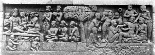| Keywords: COLLECTIE TROPENMUSEUM Reliëf O 19 op de verborgen voet van de Borobudur TMnr 10015757.jpg nl Repronegatief Negatief waarop reliëf O 19 van de verborgen voet van de Borobudur te zien is De verborgen voet van de Borobudur is de oorspronkelijke basis van het Buddhistische heiligdom dat rond 800 gebouwd is In een latere fase van de bouw werd deze basis verborgen waarschijnlijk om verzakking te verkomen De verborgen voet loopt om het hele bouwwerk heen en bevat 160 reliëfs die tezamen de Mahakarmawibhangga verbeelden een Mahayanistische tekst die de werking van de leer van Karma uiteenzet Deze leerrede wordt aan Buddha toegeschreven en handelt over oorzaak en gevolg N J Krom en Th van Erp duiden in hun standaardwerk over de Borobudur Beschrijving van Barabudur Den Haag Martinus Nijhoff 1920-1931 de reliëfs van de verborgen voet aan als serie O Op de reliëfs zijn voorbeelden van de theorie uitgebeeld goede daden hebben goede gevolgen en slechte daden hebben slechte gevolgen De reliëfs vallen in twee delen uiteen O 1 tot en met O 117 verbeelden een aantal daden die leiden tot één en hetzelfde gevolg De reliëfs O 118 tot en met O 160 tonen verschillende gevolgen van één oorzaak De uiteenzetting van de leer begint bij de trap aan de oostzijde en ontrolt zich met de klok mee om het bouwwerk heen De reliëfs moeten dan ook gelezen worden van rechts naar links Lange tijd was onbekend wat op de reliëfs van de verborgen voet stond afgebeeld Hoewel de reliëfs al in 1885 waren ontdekt door Dr Ir J W IJzerman 1851-1932 kon de Franse geleerde Sylvain Lévi pas in 1929 op het zesde Congres van het Oostersch Genootschap constateren dat het op de verborgen voet ging om een Buddhistische tekst Mahakarmawibhangga Lévi had in 1922 een manuscript uit 1411 met deze tekst ontdekt in Kathmandu Nepal De tekst bleek populair in de Burdhistische wereld te zijn en een aantal verwante teksten te hebben twee Chinese werken waarvan één vertaald was in 582 door Gautama Dharmaprajna en één tussen 980 en 1000 door T'ien si Tsai Daarnaast bevat de Tibetaanse Kanjur twee werken met de titel Karmawibhangga In 1933 publiceerde de archeoloog N J Krom een uitgebreide analyse van het Mahakarmawibhangga op de reliëfs van de bedolven voet Hierin legt hij een relatie tussen de afbeeldingen op de reliëfs en de tekstpassages in het Mahakarmawibhangga Reliëf O 19 bevindt zich aan de oostzijde van de Borobudur en correspondeert volgens N J Krom met de vierde paragraaf van het Mahakarmawibhangga Wat is de daad die weinig pijnen ten gevolge heeft Antwoord het afzien van het geven van stompen en slagen; het aanzetten daartoe; het prijzen daarvan; het zich daar hogelijk op verheugen; zijn uitgeputte vader en moeder van dienst zijn en ook anderen huisvaders en zwervende geestelijken; niet tevreden zijn over de ziekte van een vijand; tevreden zijn met diens herstel; het geven van geneesmiddelen en goed verteerbaar voedsel Dat is de daad die weinig pijnen ten gevolge heeft Uit N J Krom Het Karmawibhangga op Barabudur Mededeelingen der koninklijke academie van wetenschappen afdeeling letterkunde deel 76 serie B No 8 Amsterdam Noordhollandsche Uitgevers-Maatschappij 1933 222 De beeldhouwer toont de toestand van weinig pijnen op reliëfs O 16 tot en met O 19 door middel van de afbeelding van een aanzienlijke man met zijn gezin en dienaren Op 19a krijgt een zieke persoon geneesmiddelen en voedsel Uit zijn houding blijkt volgens Krom dat die hem goed doen Bronnen A J Bernet Kempers Borobudur Mysteriegebeuren in steen Verval en restauratie Oudjavaans volksleven Wassenaar 1973/gewijzigde herdruk ; Van Erp Th Krom N J Beschrijving van Barabudur Den Haag Martinus Nijhoff 1920-1931 ; N J Krom Het Karmawibhangga op Barabudur Mededeelingen der koninklijke academie van wetenschappen afdeeling letterkunde deel 76 serie B No 8 Amsterdam Noordhollandsche Uitgevers-Maatschappij 1933 Reliëf O 19 op de verborgen voet van de Borobudur 1890-1891 institution Tropenmuseum KIT-source 10015757 Creator Kassian Cephas KIT-license PD-old-100 Photographs by Kassian Cephas Tropenmuseum Borobudur reliefs Borobudur in 1890 Black and white photographs |