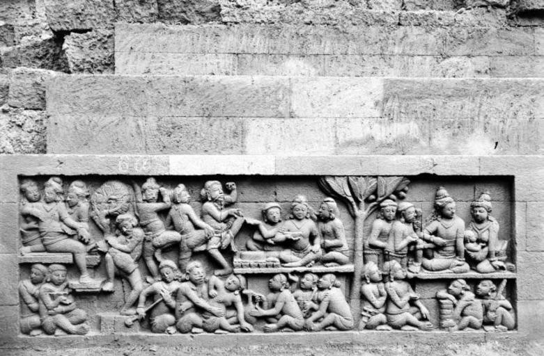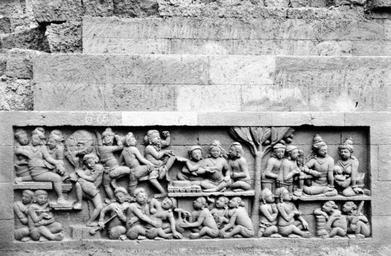 | Keywords: COLLECTIE TROPENMUSEUM Reliëf O 20 op de verborgen voet van de Borobudur TMnr 10015758.jpg nl Negatief Negatief waarop reliëf O 20 van de verborgen voet van de Borobudur te zien is De verborgen voet van de Borobudur is de oorspronkelijke basis van het Buddhistische heiligdom dat rond 800 gebouwd is In een latere fase van de bouw werd deze basis verborgen waarschijnlijk om verzakking te verkomen De verborgen voet loopt om het hele bouwwerk heen en bevat 160 reliëfs die tezamen de Mahakarmawibhangga verbeelden een Mahayanistische tekst die de werking van de leer van Karma uiteenzet Deze leerrede wordt aan Buddha toegeschreven en handelt over oorzaak en gevolg N J Krom en Th van Erp duiden in hun standaardwerk over de Borobudur Beschrijving van Barabudur Den Haag Martinus Nijhoff 1920-1931 de reliëfs van de verborgen voet aan als serie O Op de reliëfs zijn voorbeelden van de theorie uitgebeeld goede daden hebben goede gevolgen en slechte daden hebben slechte gevolgen De reliëfs vallen in twee delen uiteen O 1 tot en met O 117 verbeelden een aantal daden die leiden tot één en hetzelfde gevolg De reliëfs O 118 tot en met O 160 tonen verschillende gevolgen van één oorzaak De uiteenzetting van de leer begint bij de trap aan de oostzijde en ontrolt zich met de klok mee om het bouwwerk heen De reliëfs moeten dan ook gelezen worden van rechts naar links Lange tijd was onbekend wat op de reliëfs van de verborgen voet stond afgebeeld Hoewel de reliëfs al in 1885 waren ontdekt door Dr Ir J W IJzerman 1851-1932 kon de Franse geleerde Sylvain Lévi pas in 1929 op het zesde Congres van het Oostersch Genootschap constateren dat het op de verborgen voet ging om een Buddhistische tekst Mahakarmawibhangga Lévi had in 1922 een manuscript uit 1411 met deze tekst ontdekt in Kathmandu Nepal De tekst bleek populair in de Burdhistische wereld te zijn en een aantal verwante teksten te hebben twee Chinese werken waarvan één vertaald was in 582 door Gautama Dharmaprajna en één tussen 980 en 1000 door T'ien si Tsai Daarnaast bevat de Tibetaanse Kanjur twee werken met de titel Karmawibhangga In 1933 publiceerde de archeoloog N J Krom een uitgebreide analyse van het Mahakarmawibhangga op de reliëfs van de bedolven voet Hierin legt hij een relatie tussen de afbeeldingen op de reliëfs en de tekstpassages in het Mahakarmawibhangga Reliëf O 20 bevindt zich aan de oostzijde van de Borobudur en correspondeert volgens N J Krom met de vijfde paragraaf van het Mahakarmawibhangga Wat is de daad die wanstaltigheid ten gevolge heeft Antwoord toorn; haatdragendheid; geveinsdheid; bitsheid; kwaadspreken van vader en moeder en van anderen huisvaders en zwervende geestelijken kinderen en grijsaards; het niet schoonhouden van den grond van stupa-hoven caitya-monumenten en kloosters; het vernielen van lampen van stupa's en beelden; het uitlachen van wanstaltige wezens; desgelijks een onbehoorlijk gedrag Dat is de daad die wanstaltigheid ten gevolge heeft Uit N J Krom Het Karmawibhangga op Barabudur Mededeelingen der koninklijke academie van wetenschappen afdeeling letterkunde deel 76 serie B No 8 Amsterdam Noordhollandsche Uitgevers-Maatschappij 1933 222 Van reliëf O 20 is moeilijk te zeggen wat erop te zien is De groep op het linkertafereel bestaat zeker niet uit lelijke personen 20a toont een gesprek maar biedt geen duidelijkheid Op 20b dansen en drinken brahmanen Één van hen pakt zelfs een vrouw beet Dit is volgens Krom het onbehoorlijke gedrag dat in de tekst aan het einde van paragraaf 5 genoemd wordt Bronnen A J Bernet Kempers Borobudur Mysteriegebeuren in steen Verval en restauratie Oudjavaans volksleven Wassenaar 1973/gewijzigde herdruk ; Van Erp Th Krom N J Beschrijving van Barabudur Den Haag Martinus Nijhoff 1920-1931 ; N J Krom Het Karmawibhangga op Barabudur Mededeelingen der koninklijke academie van wetenschappen afdeeling letterkunde deel 76 serie B No 8 Amsterdam Noordhollandsche Uitgevers-Maatschappij 1933 Reliëf O 20 op de verborgen voet van de Borobudur 1890-1891 institution Tropenmuseum KIT-source 10015758 Creator Kassian Cephas KIT-license PD-old-100 Photographs by Kassian Cephas Tropenmuseum Borobudur reliefs Borobudur in 1890 Black and white photographs |