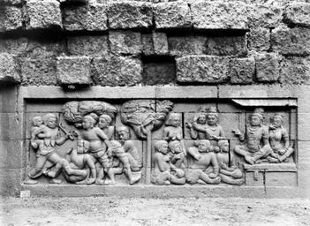 | Keywords: COLLECTIE TROPENMUSEUM Reliëf O 25 op de verborgen voet van de Borobudur TMnr 10015763.jpg nl Negatief Negatief waarop reliëf O 25 van de verborgen voet van de Borobudur te zien is De verborgen voet van de Borobudur is de oorspronkelijke basis van het Buddhistische heiligdom dat rond 800 gebouwd is In een latere fase van de bouw werd deze basis verborgen waarschijnlijk om verzakking te verkomen De verborgen voet loopt om het hele bouwwerk heen en bevat 160 reliëfs die tezamen de Mahakarmawibhangga verbeelden een Mahayanistische tekst die de werking van de leer van Karma uiteenzet Deze leerrede wordt aan Buddha toegeschreven en handelt over oorzaak en gevolg N J Krom en Th van Erp duiden in hun standaardwerk over de Borobudur Beschrijving van Barabudur Den Haag Martinus Nijhoff 1920-1931 de reliëfs van de verborgen voet aan als serie O Op de reliëfs zijn voorbeelden van de theorie uitgebeeld goede daden hebben goede gevolgen en slechte daden hebben slechte gevolgen De reliëfs vallen in twee delen uiteen O 1 tot en met O 117 verbeelden een aantal daden die leiden tot één en hetzelfde gevolg De reliëfs O 118 tot en met O 160 tonen verschillende gevolgen van één oorzaak De uiteenzetting van de leer begint bij de trap aan de oostzijde en ontrolt zich met de klok mee om het bouwwerk heen De reliëfs moeten dan ook gelezen worden van rechts naar links Lange tijd was onbekend wat op de reliëfs van de verborgen voet stond afgebeeld Hoewel de reliëfs al in 1885 waren ontdekt door Dr Ir J W IJzerman 1851-1932 kon de Franse geleerde Sylvain Lévi pas in 1929 op het zesde Congres van het Oostersch Genootschap constateren dat het op de verborgen voet ging om een Buddhistische tekst Mahakarmawibhangga Lévi had in 1922 een manuscript uit 1411 met deze tekst ontdekt in Kathmandu Nepal De tekst bleek populair in de Burdhistische wereld te zijn en een aantal verwante teksten te hebben twee Chinese werken waarvan één vertaald was in 582 door Gautama Dharmaprajna en één tussen 980 en 1000 door T'ien si Tsai Daarnaast bevat de Tibetaanse Kanjur twee werken met de titel Karmawibhangga In 1933 publiceerde de archeoloog N J Krom een uitgebreide analyse van het Mahakarmawibhangga op de reliëfs van de bedolven voet Hierin legt hij een relatie tussen de afbeeldingen op de reliëfs en de tekstpassages in het Mahakarmawibhangga Reliëf O 25 bevindt zich aan de zuidzijde van de Borobudur en correspondeert volgens N J Krom met de vijfde paragraaf van het Mahakarmawibhangga Wat is de daad die wanstaltigheid ten gevolge heeft Antwoord toorn; haatdragendheid; geveinsdheid; bitsheid; kwaadspreken van vader en moeder en van anderen huisvaders en zwervende geestelijken kinderen en grijsaards; het niet schoonhouden van den grond van stupa-hoven caitya-monumenten en kloosters; het vernielen van lampen van stupa's en beelden; het uitlachen van wanstaltige wezens; desgelijks een onbehoorlijk gedrag Dat is de daad die wanstaltigheid ten gevolge heeft Uit N J Krom Het Karmawibhangga op Barabudur Mededeelingen der koninklijke academie van wetenschappen afdeeling letterkunde deel 76 serie B No 8 Amsterdam Noordhollandsche Uitgevers-Maatschappij 1933 222 De reliëfs O 21 tot en met O 25 tonen monsterachtige figuren Op O 25 worden monsterachtige personen uitgescholden Bronnen A J Bernet Kempers Borobudur Mysteriegebeuren in steen Verval en restauratie Oudjavaans volksleven Wassenaar 1973/gewijzigde herdruk ; Van Erp Th Krom N J Beschrijving van Barabudur Den Haag Martinus Nijhoff 1920-1931 ; N J Krom Het Karmawibhangga op Barabudur Mededeelingen der koninklijke academie van wetenschappen afdeeling letterkunde deel 76 serie B No 8 Amsterdam Noordhollandsche Uitgevers-Maatschappij 1933 Reliëf O 25 op de verborgen voet van de Borobudur 1890-1891 institution Tropenmuseum KIT-source 10015763 Creator Kassian Cephas KIT-license PD-old-100 Photographs by Kassian Cephas Tropenmuseum Borobudur reliefs Borobudur in 1890 Black and white photographs |
