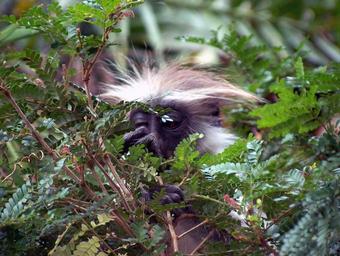 Keywords: colobus monkey tree leaves wild nature wildlife monkey branch outdoors primate wilderness animals resting forest sitting mammal endangered young looking zanzibar africa