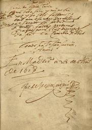 | Keywords: Colofón de La dama boba (autógrafo).jpg es Colofón de La dama boba comedia Inc Que lindas posadas Exp da fin la comedia boba Fechada y firmada al final En Madrid a 28 de abril / de 1613 / Lope de Vega Carpio <br><br>Leyenda <br> será tu esposa Turín <br> TURÍN Mi bota será y mi novia <br> FENISO Vos y yo sólo faltamos;<br> dad acá esa mano hermosa <br> DUARDO Al senado la pedid <br> si nuestras faltas perdona;<br> que aquí para los discretos <br> da fin la comedia boba <br><br> Loado sea el Santísimo Sacramento<br> Amén<br> En Madrid a 28 de abril<br> de 1613<br><br> Lope de Vega Carpio rúbrica http //bibliotecadigitalhispanica bne es/webclient/DeliveryManager pid 198696 custom_att_2 simple_viewer Lope de Vega 1613-04-28 Portada 100px La dama boba 1613 documents PD-old-100 |