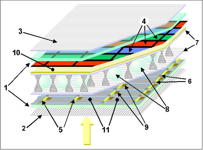 | Keywords: Color TFT-LCD Layout.png EN Schematic layout of a TFT-LCD display<br /> DE Schematischer Aufbau eines TFT-LCD-Bildschirms 1 EN Glass plates FR Plaques de verre DE Glasplatten ES Placas de vidrio 2+3 EN Horizontal and vertical polarisers FR Filtres polarisant vertical et horizontal DE Horizontale und Vertikale Polarisationsfilter ES Polarizadores horizontal y vertical 4 EN RGB colour mask FR Masque de couleur RVB DE RGB-Farbmaske ES Máscara de color RGB 5+6 EN Horizontal and vertical command lines FR Lignes de commande horizontales et verticales DE Horizontale und Vertikale Ansprechreihen ES Líneas de control horizontales y verticales 7 EN Rugged polymer layer FR Couche de polymère rayée DE Stabile Polymerschicht ES Capa de polímero 8 EN Spacers FR Billes d'espacement DE Abstandshalter ES Separadores 9 EN Thin film transistors FR Transistors en film mince DE Dünnschichttransistoren ES Transistores TFT 10 EN front electrode FR Electrode avant DE Frontelektrode ES Electrodo frontal 11 EN rear electrodes FR Electrodes arrières DE Hintere Elektroden ES Electrodos traseros schematic drawings of LCDs TFT schemas |