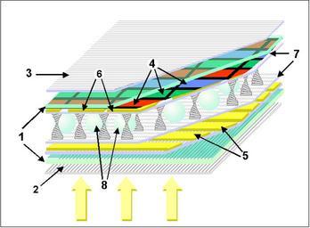 | Keywords: Color TN-LCD Layout.png Schéma d'un écran LCD-TN / Schematic layout of a colour TN LCD display; Personal drawing 1 Plaque de verre / Glass; 2 3 Polarisants vertical et horizontal / Vertical and horizontal polarizing filters; 4 Filtre couleur RVB / RGB colour filter; 5 6 Electrodes horizontales et verticales / Horizontal and vertical electrodes grid; 7 Couches polyimide d'alignement / Alignment polyimide layers; 8 Billes d'espacement / spacers Comments are welcome 2005-11-20 own assumed Lozère schematic drawings of LCDs Electronic devices Diagrams labelled with numbers only Polyimides |