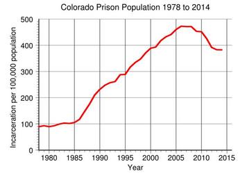 | Keywords: Colorado Prison Population.svg en Colorado prison incarceration rate per 100 000 population from 1978 to 2014 Data from http //www bjs gov/index cfm ty nps BJS 2016-05-11 own Delphi234 other versions current annually Generated with Wikimedia SVG Chart SVG Chart/box cc-zero Prisons in Colorado Imprisonment and detention rates in the United States |