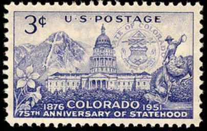 | Keywords: Colorado statehood 1951 U.S. stamp.tiff en Colorado celebrated its statehood 75th anniversary with a 3-cent stamp on August 1 1951 The central design is of Colorado ™s capitol building flanked in the background with Mount of the Holy Cross and the state seal In the foreground appear the state flower the columbine and mounted cowboy 2014-04-09 17 22 50 Arago people postage the post online National Postal Museum Bureau of Printing and Engraving PD-USGov Uploaded with UploadWizard U S territories on stamps Stamps of the United States 1951-1960 |