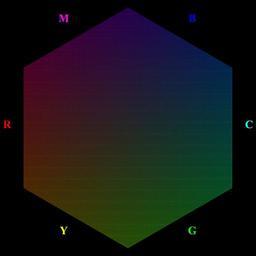 | Keywords: ColorCube-Equatorial-Cross-section.png en This is a cross section through the RGB color cube as close to the equator of its intensities as possible It contains all 98 304 relevant colors plus the 7 of the labels and background Since the quantity of permissible intensity values is even there is no single middle value So this file contains both the closest planes on the high side and the low side of the exact center All the right-pointing triangles have total intensities of 382 while the left-pointers have 383 This file was made by creating 3 images of a gradient of all possible grays then copying it twice and rotating the copies 120 degrees clockwise and anticlocwise Then the 3 images were combined into one as its R G and B channels Then the antialiasing was masked out to show only the relevant 98 304 colors own Organic 2009-08-31 without masking http //or9an1c deviantart com/art/Colorbeauty-135495714 The largest circle that can be inscribed in this hexagon represents the highest common chroma for a sweep of all depictable hues in the color cube Computer graphic color codes Images from deviantART |