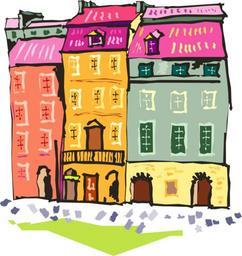 Keywords: colorful apartments building complex houses pink yellow green orange colours residential property residences exterior architecture decorative artistic bright outdoors construction flats lifestyle stylish