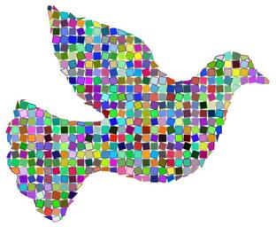 Keywords: colorful prismatic chromatic rainbow mosaic squares abstract geometric art sign symbol dove bird peace flying flight