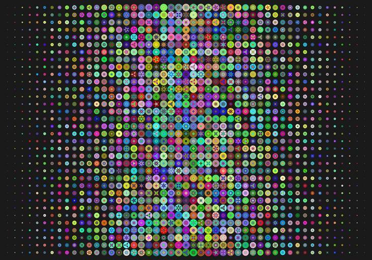 | Keywords: geometry circles color colour colors colours julia code indoor texture pattern While testing a few lines of code that produce spiky wheel shapes, I started chasing the limits of how many could be produced. I wonder if any are duplicates? Each one can encode six colours and 3 different selections of between 3 and 16 spokes, so there are about two billion different possibilities. While testing a few lines of code that produce spiky wheel shapes, I started chasing the limits of how many could be produced. I wonder if any are duplicates? Each one can encode six colours and 3 different selections of between 3 and 16 spokes, so there are about two billion different possibilities. |