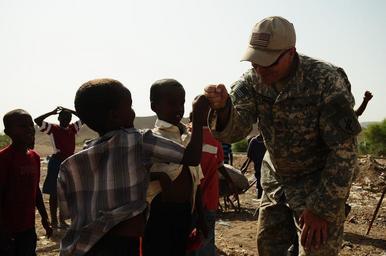 | Keywords: Combined Joint Task Force - Horn of Africa Participates in 'Green Day' DVIDS194344.jpg en Staff Sgt Michael MacDonald of the 478th Army Civil Affairs Battalion plays with local children while clean up efforts continue in the city of Ali Sabieh Djibouti Service members from Combined Joint Task Force-Horn of Africa joined Djiboutian residents to participate in a citywide cleanup project Aug 9 2009-08-09 Petty Officer 2nd Class Kelly Ontiveros https //www dvidshub net/image/194344 090809-N-+++++-482 2009-08-12 08 16 ALI SABIEH DJ PD-USGov-Military-Navy Combined Joint Task Force - Horn of Africa Images from DoD uploaded by Fæ |