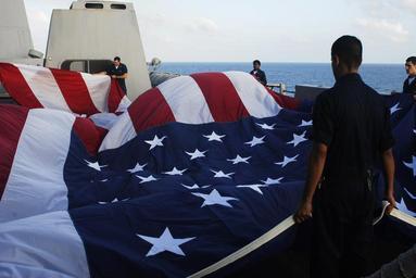 | Keywords: Combined Task Force 151 - 090112-N-3218H-005.jpg en 090112-N-3218H-005 GULF OF ADEN Jan 12 2009 Sailors aboard the amphibious transport dock ship USS San Antonio LPD-17 fold a 30-foot by 60-foot national ensign after flying the flag over the ship San Antonio is the command ship for Combined Task Force CTF 151 CTF 151 is a multi-national task force conducting counter-piracy operations in and around the Gulf of Aden Arabian Sea Indian Ocean and Red Sea and was established to create a lawful maritime order and develop security in the maritime environment U S Navy photo by Mass Communication Specialist 3rd Class Christopher Hall/Released http //www navy mil/management/photodb/photos/090112-N-3218H-005 jpg Official U S Navy Photograph Mass Communication Specialist 3rd Class Christopher Hall USN 2009-01-12 PD-USGov-Military-Navy Combined Task Force 151 Military in the Horn of Africa Aboard USS San Antonio LPD 17 Military people with a flag of the United States Folding of flags of the United States |