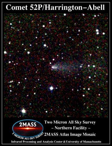Keywords: Comet 52P Harrington-Abell 2MASS.jpg Atlas Image mosaic of comet 52P/Harrington-Abell which was serendipitously observed by 2MASS on 1998 Oct 8 UT and is among twenty comets included in the 2MASS Second Incremental Data Release Comets of course are within our Solar System and orbit the Sun and therefore do not move sidereally that is as the stars do Astronomers however have determined the ephemerides or orbital parameters for large numbers of known comets so their positions in the sky along their orbits can be accurately predicted Occasionally comets asteroids and even planets can accidentally wander into the Survey Comets reflect sunlight yet near-infrared photometry can provide useful compositional and structural information about these objects This comet was seen optically to experience a significant outburst in 1998 July IAUC 6975 and became unusually bright by August IAUC 6994 exceeding visual magnitude 11 by 1999 February IAUC 7113 Its coma diameter was 1-2´ and tail length of about 2´ in 1998 IAUC 6975 In 2001 December the comet was seen to have split into two IAUC 7769 following a brightening by more than two magnitudes between 2001 August and September IAUC 7773 http //www ipac caltech edu/2mass/gallery/images_ss html 2MASS Atlas Image Gallery Solar System Objects Two Micron All Sky Survey 2MASS a joint project of the University of Massachusetts and the Infrared Processing and Analysis Center/California Institute of Technology funded by the National Aeronautics and Space Administration and the National Science Foundation 2MASS Atlas image Comets 2MASS images |