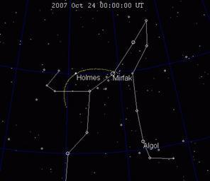 | Keywords: Comet Holmes simulation 120 days.gif Full Sky Observatory The gas and dust cloud surrounding Comet Holmes is expanding at a rate of about 42000km/day http //www ifa hawaii edu/faculty/jewitt/holmes html This plot simulates the retrograde motion of Comet Holmes over 120 days 60 frames after the outburst showing the diameter increase over time It will continue to get harder to see visually as its surface brightness falls but a cloud like this may continue to be visible over the coming weeks and months On each frame yellow dots show the position of the comet in the previous and following 30-days Contrast to actual photo composite of the comet showing the motion and expansion at http //www cs cmu edu/~pane/Holmes/ Orbital elements from http //www cfa harvard edu/iau/Ephemerides/Comets/0017P html en wikipedia Drilnoth CommonsHelper 2007-11-17 Tomruen wikipedia en Tomruen Original upload log page en wikipedia Comet_Holmes_simulation_120_days gif 2007-11-17 07 41 Tomruen 471×407× 338028 bytes <nowiki>Slightly larger less star names</nowiki> 2007-11-17 07 33 Tomruen 320×273× 584567 bytes <nowiki>Comet Holmes is expanding at a rate of about 42000km/day http //www ifa hawaii edu/faculty/jewitt/holmes html This plot simulates the retrograde motion of Comet Holmes over 120 days 60 frames after the outburst showing the diameter increase over</nowiki> 17P/Holmes Animated GIF Animations on black background |