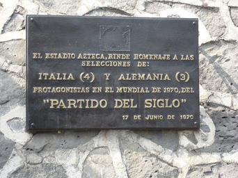 | Keywords: Commemorative plaque Aztec Stadium.jpg LangSwitch Commemorative plaque at Stadium Azteca Mexico City for the so called Partido del Siglo Game of the Century the association football game between Italy and West Germany which Italy eventually won 4-3 a e t after a dramatic match The plate is written in Spanish and its tranlations reads The Azteca Stadium pays homage to the National Teams of Italy 4 and Germany 3 who starred in the 1970 FIFA World Cup the Game of the Century June 17th 1970 Gedenktafel am Aztekenstadion in Mexiko Stadt an das sogenannte žJahrhundertspiel im Halbfinale der Fußball-Weltmeisterschaft 1970 zwischen Italien und Deutschland das Italien nach dramatischen Ereignissen mit 4 3 nach Verlängerung gewann <br /> žDas Azteken-Stadion erweist den Nationalmannschaften Italiens 4 und Deutschlands 3 Hauptdarstellern des žJahrhundertspiels vom 17 Juni 1970 bei der Weltmeisterschaft 1970 die Ehre Plaqueta commemorativa ante el Estadio Azteca en la Ciudad de Mexico para El partido del siglo el partido en que encontraron Italia y Alemania en la semifinal de la Copa Mundial de Fútbol 1970 cual terminó con una dramatica victoria italiana por 4 3 en tiempo extra Targa commemorativa della c d Partita del Secolo nello stadio Azteca di Città del Messico; in tale luogo il 17 giugno 1970 durante il VII campionato mondiale di calcio si affrontarono in semifinale le Nazionali di Italia e Germania Occidentale L ™Italia vinse 4-3 dopo i tempi supplementari al termine di un incontro che durante il suo svolgimento vide entrambe le squadre in vantaggio e poi raggiunte sul pareggio comunque mai separate da più di un goal di differenza L ™iscrizione sulla targa tradotta dallo spagnolo recita «Lo stadio Azteca rende omaggio alle Nazionali di Italia 4 e Germania 3 protagoniste nel campionato mondiale del 1970 della Partita del Secolo 17 giugno 1970» Plaque commémorative au stade Azteca à Mexico du match entre les équipes d ™Italie et de la République fédérale d ™Allemagne demi-finale de la Coupe du monde de football 1970 Le match qui fût gagné 4-3 par l ™Italie après la prolongation est considéré comme le « match du siècle » et cette plaque le commémore <br />Sur la plaque les phrases suivantes sont gravés « Le stade Azteca rend hommage aux équipes nationales de l'Italie 4 et l'Allemagne 3 qui ont joué dans cette Coupe du Monde de la FIFA 1970 le Match ‹ ‹ du siècle 17 juin 1970 » Aztekenstadion jpg on de wiki Hellner de German Wikipedia Hellner Plaques in Mexico FIFA World Cup 1970 Estadio Azteca 17 June Matches of Italy national football team Matches of Germany national football team |