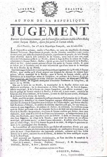 | Keywords: Commission militaire révolutionnaire de Saint-Malo - An 2 - jugement peine de mort imprimé.jpg fr Jugement imprimé de la Commission militaire révolutionnaire siégeant à Saint-Malo dite O'Brien en l'an II condamnant un habitant de la commune de La Boussac Ille-et-Vilaine à être fusillé sur la grève pour avoir fourni des chevaux aux contre-révolutionnaires rebelles Plusieurs de ces condamnations de ce tribunal d'exception ou d'autres ayant siégé en Ille-et-Vilaine ont été imprimés en format A3 ou plus pour être affichés aux lieux les plus judicieux <br />Publié en annexe de «Le jugement des Chouans par les commissions militaires d'Ille-et-Vilaine 1793-1795» Hervé Tigier Cercle généalogique d'Ille-et-Vilaine 1988 own TigH 2010 Documents of France History of Saint-Malo La Boussac 1794 in Bretagne |