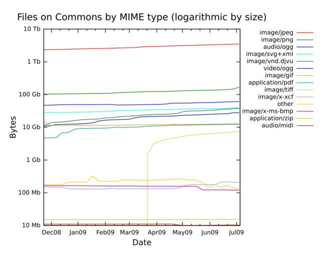 | Keywords: Commons MIME statistics bytes 2008-11-23 to 2009-07-06.svg en A logarithmic plot of the total file size in bytes by MIME type from formatdate 2008-11-23 to formatdate 2009-07-06 on Commons as gathered by MIMEStatBot own ; plotted with gnuplot based on raw data at http //toolserver org/~vyznev/stats/commons_mime_statistics_data txt Ilmari Karonen 2009-07-06 <gallery> File Commons MIME statistics files 2008-11-23 to 2009-07-06 svg By number of files </gallery> Other fields G + Notes Ogg audio and video files are listed as audio/ogg and video/ogg respectively even though the database currently lists both as application/ogg The image/x-xcf counts include files listed as unknown/unknown since they seem to be almost exclusively XCF files The application/zip files are almost exclusively OpenOffice documents Files of type image/x-ms-bmp have been listed separately despite not being an officially allowed file format on Commons since a considerable number of them still remain cc-zero Data in tabular format wikitable Date image/jpeg image/png audio/ogg image/svg+xml image/vnd djvu video/ogg image/gif application/pdf image/tiff image/x-xcf Other image/x-ms-bmp application/zip audio/midi - align right left formatdate 2008-11-23 2 332 221 103 737 102 726 419 242 47 097 841 642 28 013 135 625 11 263 667 127 10 886 920 136 14 816 016 938 4 719 393 753 0 151 229 679 180 099 913 164 262 232 15 084 555 10 959 651 - align right left formatdate 2008-11-30 2 355 330 609 359 103 324 250 934 47 516 168 582 28 231 971 738 13 553 238 968 11 036 725 155 11 565 338 497 4 761 460 218 0 148 576 478 177 324 731 164 262 232 15 084 555 10 978 164 - align right left formatdate 2008-12-07 2 380 074 907 204 104 196 251 563 48 281 942 321 28 377 102 257 14 283 960 820 12 093 527 848 11 328 694 814 4 853 476 532 0 148 576 478 178 282 919 164 262 232 15 084 555 10 985 074 - align right left formatdate 2008-12-14 2 404 870 938 610 104 771 933 726 48 994 973 485 28 597 623 069 14 618 763 327 12 354 278 815 11 382 577 559 6 820 297 619 0 148 706 468 178 347 574 164 262 232 15 084 555 11 010 023 - align right left formatdate 2008-12-21 2 427 440 875 764 105 263 912 074 49 273 663 545 28 818 460 855 15 281 608 415 12 408 525 250 11 455 705 632 6 844 629 481 0 131 782 857 208 008 354 164 101 498 15 084 555 11 010 022 - align right left formatdate 2008-12-28 2 453 433 978 685 105 848 915 162 49 275 571 014 28 956 190 743 16 059 242 515 12 538 376 194 11 570 454 171 8 760 675 306 0 131 782 857 207 871 336 164 101 498 15 084 555 11 003 917 - align right left formatdate 2009-01-04 2 483 876 977 575 106 499 313 413 49 387 362 672 29 171 516 707 16 938 878 132 12 701 197 078 11 503 919 983 9 180 333 297 0 129 781 786 215 099 761 163 402 852 15 084 555 11 006 683 - align right left formatdate 2009-01-11 2 509 707 472 845 107 299 412 858 49 450 069 524 29 382 281 278 17 418 310 734 13 081 379 855 11 536 885 756 9 186 841 347 0 129 814 585 207 373 661 163 402 852 15 084 555 11 021 632 - align right left formatdate 2009-01-18 2 534 249 604 490 107 614 862 244 49 511 777 368 29 600 562 453 17 707 522 352 13 669 772 667 11 577 045 722 9 342 152 992 0 130 526 977 325 039 029 162 404 014 15 082 888 11 021 632 - align right left formatdate 2009-01-25 2 556 953 433 071 108 429 006 223 49 715 998 495 30 011 032 207 18 109 662 537 15 519 397 599 11 521 044 700 9 398 784 122 0 129 985 958 227 733 764 161 361 778 15 082 888 11 045 486 - align right left formatdate 2009-02-01 2 585 097 041 135 109 150 089 976 49 830 013 615 30 903 747 334 19 287 251 705 16 474 609 035 11 419 150 816 9 466 785 653 0 129 793 314 224 985 623 160 607 470 15 082 888 11 019 222 - align right left formatdate 2009-02-08 2 609 848 013 509 110 098 550 728 49 942 459 404 31 192 711 263 19 686 565 591 16 916 922 210 11 488 340 459 9 712 840 415 0 138 697 261 222 368 253 160 607 470 15 082 888 11 033 858 - align right left formatdate 2009-02-15 2 639 459 921 360 113 140 037 470 48 032 481 691 31 851 686 740 20 566 252 147 17 078 305 976 11 543 245 039 10 070 169 400 0 130 237 265 224 525 291 160 607 470 15 082 888 11 035 255 - align right left formatdate 2009-02-22 2 668 983 709 579 115 747 653 245 48 183 097 795 32 248 987 678 21 545 063 799 17 374 433 417 11 636 202 554 9 828 230 333 0 132 146 297 246 381 547 160 607 470 15 082 888 11 044 362 - align right left formatdate 2009-03-01 2 694 601 352 970 118 262 958 468 48 327 675 912 32 566 908 103 21 842 340 343 17 687 195 807 11 704 318 298 10 083 797 640 0 131 729 987 246 384 783 160 607 470 15 082 888 11 073 319 - align right left formatdate 2009-03-08 2 741 696 467 139 119 405 878 325 48 639 854 739 32 876 558 375 22 663 047 907 19 595 840 139 11 751 191 608 10 170 221 194 0 132 689 928 246 384 783 160 607 470 15 082 888 11 073 712 - align right left formatdate 2009-03-15 2 855 375 894 097 121 665 503 068 49 119 817 029 33 192 340 644 23 331 891 226 20 933 536 185 11 826 277 287 10 281 764 891 0 132 689 928 241 164 331 158 970 004 15 082 888 11 052 143 - align right left formatdate 2009-03-22 2 897 386 385 827 122 395 572 382 49 658 606 135 33 979 825 727 24 168 422 096 21 198 718 057 11 883 672 512 10 832 034 365 1 537 498 919 133 116 692 238 937 767 158 970 004 15 082 888 11 061 683 - align right left formatdate 2009-03-29 2 929 296 356 105 123 111 524 053 49 975 583 281 34 331 862 037 24 518 239 101 21 423 376 809 12 048 127 207 10 925 414 108 3 195 133 438 133 116 692 246 993 510 158 970 004 15 082 888 11 066 240 - align right left formatdate 2009-04-05 2 968 059 044 608 123 644 491 163 50 255 686 255 34 631 255 812 24 849 769 276 21 717 269 993 12 062 475 751 11 121 722 367 3 701 086 004 133 245 703 244 631 386 158 970 004 15 082 888 11 115 003 - align right left formatdate 2009-04-12 3 017 035 395 637 124 544 619 298 51 267 591 944 34 860 334 993 25 083 478 488 21 871 472 086 12 082 933 142 11 208 890 080 4 184 675 041 133 988 005 248 760 260 158 970 004 15 082 888 11 115 003 - align right left formatdate 2009