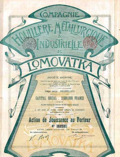 Keywords: Companie Hovillere & Industrielle de Lomovatka.jpg Комания угольных шахт и п омышленных п едп иятий Ломоватки Companie Hovillere Industrielle de Lomovatka Акция http //infodon org ua/postal/281 < 1917 author PD-RusEmpire Stock certificates from Luhansk Oblast Files uploaded by Andrew Butko from various sources Images from infodon org ua |