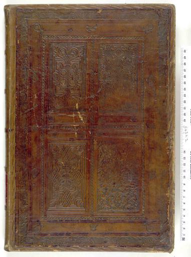 Keywords: Compendiosa totius Anatomie delineatio, - Upper cover (c43h2).jpg Style Panel design Dated; Caption Upper cover; Colour Brown; Edge Unspecified exhibition history Decorative Technique Tooled in blind Panel stamp in blind; Cover Material Calf This may well be tooled in gold not blind Possibly bound in Saxony or Tubingen Macchi states; A very similar altough not identical panel-stamp example upper cover 1 st top right; lower cover 3 rd bottom left is reproduced in M Von Arnim's Einbandkunst n 46 on Martin Luther Eine einfeltige weise zu beten für einen guten Freund Leipzig Valentin Baptist 1551 An analogous cover bound in Tübingen by the Jakob Andreä Master kept in the Biblioteca Apostolica Vaticana I Schunke Die Einbände der Palatina pl IC no text is reproduced in M von Arnim's Einbandkunst n 70 on Jean Jacques Boissard Emblematum liber Frankfurt M Theodor de Bry 1593 too The layout is analogous but the background is richer in the second panel-stamp kind I Schunke refers in this last case to a Samuel Streler see C 24 a 18 C 65 l 9 successor because of the bindings he produced for the Tübingen theologian Jakob Andreä 1528-1590 object history Text 1553; London; Unspecified object type Cc-zero place of creation Binding Germany place of discovery Unspecified British Library image http //www bl uk/catalogues/bookbindings/LargeImage aspx RecordId 020-000006230 ImageId ImageId 42720 Copyright BL Compendiosa totius Anatomie delineatio Uploaded with GWToolset Compendiosa totius Anatomie delineatio - Upper cover c43h2 http //www webarchive org uk/bldatasets/bindings/7871_4 jpg Bookbinding 16th-century bookbinding British Library Bookbindings