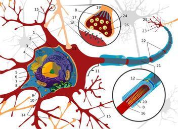 | Keywords: Complete neuron cell diagram numbered.svg Complete neuron cell diagram Neurons also known as neurones and nerve cells are electrically excitable cells in the nervous system that process and transmit information In vertebrate animals neurons are the core components of the brain spinal cord and peripheral nerves it Diagramma completo di una cellula neuronale <table><tr> <br>1 Reticolo endoplasmatico rugoso corpo di Nissl <br>2 Poliribosomi <br>3 Ribosomi <br>4 Apparato Golgi <br>5 Nucleo <br>6 Nucleolo <br>7 Membrana <br>8 Microtubuli <br>9 Mitocondrio <br>10 Reticolo endoplasmatico liscio <br>11 Cono di emergenza assone <br>12 Nucleo cellula di Schwann <br>13 Sinapsi assone somatico <br>14 Sinapsi assone dendritico <br>15 Dendriti <br>16 Assone <br>17 Neurotrasmettitore <br>18 Recettore <br>19 Sinapsi <br>20 Microfilamenti <br>21 Guaina mielinica cellula di Schwann <br>22 Nodo di Ranvier <br>23 Terminale assonale <br>24 Vescicole assonali <br>25 Sinapsi assone assone <br>26 Distanza sinaptica </tr></table> Own work Image renamed from Image Complete neuron diagram numbered svg 2007-07-12 LadyofHats LadyofHats Complete neuron cell diagram without text svg Other versions/Complete neuron cell diagram Neurobiology Diagrams labelled with numbers only Neurons Histological schematic Anatomical plates and drawings of the human nervous system |
