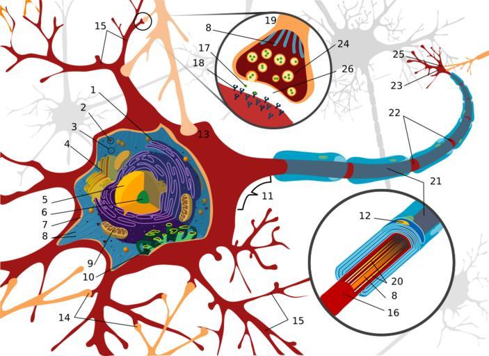 Keywords: Complete neuron cell diagram numbered.svg Complete neuron cell diagram Neurons also known as neurones and nerve cells are electrically excitable cells in the nervous system that process and transmit information In vertebrate animals neurons are the core components of the brain spinal cord and peripheral nerves it Diagramma completo di una cellula neuronale <table><tr> <br>1 Reticolo endoplasmatico rugoso corpo di Nissl <br>2 Poliribosomi <br>3 Ribosomi <br>4 Apparato Golgi <br>5 Nucleo <br>6 Nucleolo <br>7 Membrana <br>8 Microtubuli <br>9 Mitocondrio <br>10 Reticolo endoplasmatico liscio <br>11 Cono di emergenza assone <br>12 Nucleo cellula di Schwann <br>13 Sinapsi assone somatico <br>14 Sinapsi assone dendritico <br>15 Dendriti <br>16 Assone <br>17 Neurotrasmettitore <br>18 Recettore <br>19 Sinapsi <br>20 Microfilamenti <br>21 Guaina mielinica cellula di Schwann <br>22 Nodo di Ranvier <br>23 Terminale assonale <br>24 Vescicole assonali <br>25 Sinapsi assone assone <br>26 Distanza sinaptica </tr></table> Own work Image renamed from Image Complete neuron diagram numbered svg 2007-07-12 LadyofHats LadyofHats Complete neuron cell diagram without text svg Other versions/Complete neuron cell diagram Neurobiology Diagrams labelled with numbers only Neurons Histological schematic Anatomical plates and drawings of the human nervous system