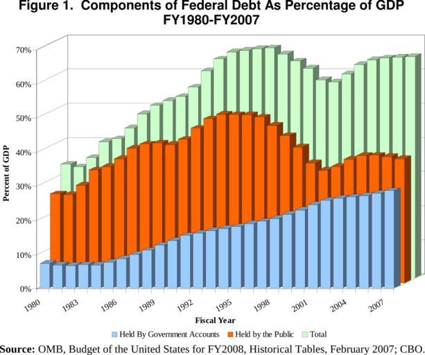 | Keywords: Components of Federal Debt as % of GDP 1980-2007.svg en Components of Federal Debt As Percentage of GDP FY1980-FY2007 Source OMB Budget of the United States for FY2008 Historical Tables February 2007; CBO http //fpc state gov/documents/organization/105193 pdf The Debt Limit History and Recent Increases CRS-6 Congressional Research Service D Andrew Austin 2008-04-29 Congressional Research Service Debt-to-GDP ratio of the United States PD-USGov Components of Federal Debt as % of GDP 1980-2007.svg en Components of Federal Debt As Percentage of GDP FY1980-FY2007 Source OMB Budget of the United States for FY2008 Historical Tables February 2007; CBO http //fpc state gov/documents/organization/105193 pdf The Debt Limit History and Recent Increases CRS-6 Congressional Research Service D Andrew Austin 2008-04-29 Congressional Research Service Debt-to-GDP ratio of the United States PD-USGov |