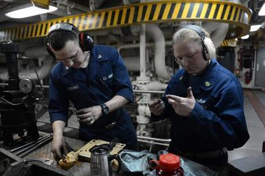 | Keywords: Composite Training Unit Exercise (COMPTUEX) 131212-N-BD629-138.jpg en Engineman 3rd Class Amell Trevino from Edinburg Texas and Chief Engineman Melanie Israel from Klamath Falls Ore hold parts after replacing a head gasket on an engine aboard the amphibious transport dock ship USS Mesa Verde LPD 19 Mesa Verde sailors and 22nd Marine Expeditionary Unit Marines are participating in a composite training unit exercise in preparation for deployment U S Navy photo by Mass Communication Specialist 3rd Class Shannon M Smith/Released 2013-12-12 Petty Officer 3rd Class Shannon Smith https //www dvidshub net/image/1138879 131212-N-BD629-138 2013-12-16 23 14 ATLANTIC OCEAN PD-USGov-Military-Navy 22nd Marine Expeditionary Unit USS Mesa Verde LPD-19 Images from DoD uploaded by Fæ |
