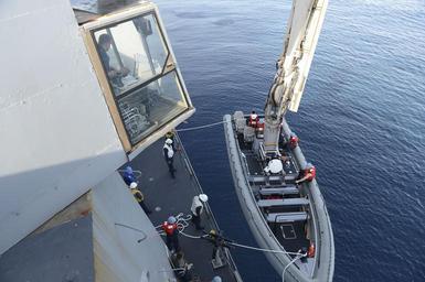 | Keywords: Composite Training Unit Exercise (COMPTUEX) 131205-N-BD629-062.jpg en Sailors assigned to the amphibious transport dock ship USS Mesa Verde LPD 19 prepare to launch a rigid-hull inflatable boat RHIB in preparation for a visit board search and seizure VBSS team training exercise Mesa Verde Sailors and 22nd Marine Expeditionary Unit 22nd MEU Marines are participating in a composite training unit exercise in preparation for deployment U S Navy photo by Mass Communication Specialist 3rd Class Shannon M Smith/Released 2013-12-05 Petty Officer 3rd Class Shannon Smith https //www dvidshub net/image/1068771 131205-N-BD629-062 2013-12-09 19 33 ATLANTIC OCEAN PD-USGov-Military-Navy 22nd Marine Expeditionary Unit USS Mesa Verde LPD-19 Images from DoD uploaded by Fæ |