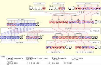 | Keywords: Composition of TEE 9 Rheingold in 1965 ja.svg ja 1965å¹´å¤ãƒ イヤã«ãŠã‘る北行TEEラインゴルト TEE 9 ã ラインプファイル TEE 21 ã®ç·¨æˆãŠã‚ˆã³è»Šä¸¡å…¥ã‚Œæ›ãˆã®å›³ã ‚ 機関車ã®äº¤æ›ã¯å›³ç¤ºã—ã¦ã„ãªã„ã ‚ã¾ãŸæ©Ÿé–¢è»Šã®ã‚·ãƒ«ã‚¨ãƒƒãƒˆï¼ˆè»¸æ•°ç‰ï¼‰ã¯æ£ç¢ºã¨ã¯é™ã‚‰ãªã„ã ‚ TEE21 ラインプファイルã¯ãƒŸãƒ¥ãƒ³ãƒ˜ãƒ³ - ãƒ•ãƒ©ãƒ³ã‚¯ãƒ•ãƒ«ãƒˆé–“é †ç·¨æˆã ‚3å·è»Šã¯ãƒ•ランクフルト - ドルトムント間ã®ã¿é £çµã ‚ Mertens Maurice; Malaspina Jean-Pierre(2007) La légende des Trans-Europ-Express LR Press ISBN 978-2-903651-45-9 p 255ã®æƒ…å ±ã«åŸºã¥ãä½ æˆã ‚ en Composition of TEE 9 Rheingold and related trains in the summer schedule of 1965 own Matsukaze 2011-02-19 TEE Rheingold |