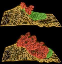 | Keywords: Computer animation showing May 18, 1980 St Helens landslide.png These illustrations show the landslide green and directed blast red that occurred during the first few minutes of the eruption of Mount St Helens in 1980 Before the eruption an estimated 0 11 km³ of dacite magma had intruded into the volcano equivalent to sphere about 600 m in diameter The rising magma forced the volcano's north flank right side of illustration outward about 150 m and heated the volcano's ground water system causing many steam-driven explosions phreatic eruptions Following a magnitude five earthquake on the morning of May 18 1980 a landslide green unroofed the hot magma and surrounding hydrothermal system and the resulting rapid depressurization caused a series of steam and volcanic gas driven explosions The explosions burst through part of the landslide blasting rock debris northward The resulting pyroclastic surge quickly overran the landslide and spread over ridges and valleys across an area of 550 km² USGS image by T R Alpha and text from http //volcanoes usgs gov/Imgs/Gif/Drawings/30210600-084_caption html Computer animation showing May 18 1980 Mount St Helens landslide USGS image by T R Alpha 1980-05 U S government PD PD-USGov 1980 eruption of Mount St Helens Lateral blasts 1980-05-18 Pyroclastic flows Dacite Diagrams of volcanic eruptions Landslide diagrams Volcanism of Mount St Helens Lava dome eruptions Diagrams of Mount St Helens |