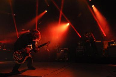 Keywords: concert guitar lights bright rock music play instrument stage guitarist male entertainment orange musician performer band playing red