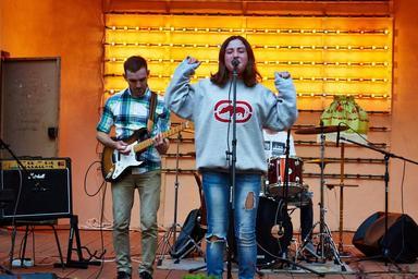 Keywords: concert singer music address by jazz microphone guitar light bulbs rock view
