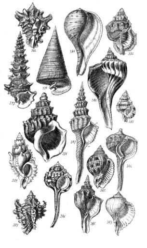 Keywords: Conchological Manual Plate 17.png Plate Fig 377 378 382 to 397 Names see below are as used in the 1842 text gutenberg A Conchological Manual 43417 1842 George Brettingham Sowerby II 1812 “1884 PD-art-100 <table> <tr><td style font-size 80 > FIG </td> <tr><td style line-height 150 ; text-align center; colspan 2 > <i>Fam </i> Canalifera </td></tr> <tr><td> 377 </td> <td> Potamis muricata Pyrazus Montf Tympanostomata Schum </td></tr> <tr><td> 378 </td> <td> Cerithium Telescopium <i>Gen </i> Telescopium </td></tr> <tr><td> 382 </td> <td> Turbinella corniger Scolymis Sw </td></tr> <tr><td> 384 </td> <td> Spirillus <i>Gen </i> Pyrella Sw Turbinella spirillus Auct </td></tr> <tr><td> 385 </td> <td> Cancellaria reticulata </td></tr> <tr><td> 386 </td> <td> Fasciolaria Trapezium </td></tr> <tr><td> 387 </td> <td> Fusus Colus; <i>a</i> anterior of the aperture; <i>p</i> posterior </td></tr> <tr><td> 388 </td> <td> Pyrula perversa Fulgur Montf </td></tr> <tr><td> 389 </td> <td> papyracea Rapanus Schum Bulbus Humph Rapella Sw </td></tr> <tr><td> 390 </td> <td> Ficus Ficula Sw </td></tr> <tr><td> 391 </td> <td> Struthiolaria straminea </td></tr> <tr><td> 393 </td> <td> Ranella ranina Apollon Montf </td></tr> <tr><td> 394 </td> <td> neglecta Bufo Montf </td></tr> <tr><td> 395 </td> <td> Murex inflatus Chicoreus Montf </td></tr> <tr><td> 396 </td> <td> haustellum Brontes Montf </td></tr> <tr><td> 397 </td> <td> Typhis tubifer from Deshayes </td></tr> </table> A conchological manual 1842 Cancellaria reticulata |