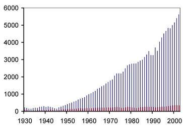 Keywords: ConcreteProduction.jpg Diagram showing the production of concrete million cubic metres from 1930 to 2002 World production in blue USA production in red Created by JohnM 2006-05-06 own assumed JohnM Concrete Production diagrams