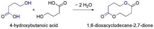 | Keywords: Condensation of 2x 4-hydroxybutanoic acid to form the lactide.png Reaction scheme of a condensation of 2 molecules of 4-hydroxybutanoic acid to form the lactide 1 6-dioxacyclodecane-2 7-dione Selfmade with ChmDraw 2006-07-16 Calvero PD GHB Substitution reactions |