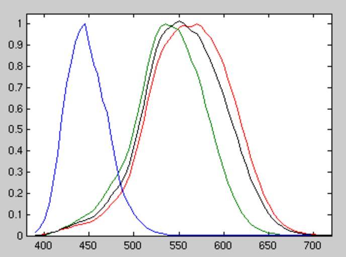 Keywords: Cones and Photopic smj2.png en wikipedia 2012 February 21 en I made this in matlab and screen captured it as a quick hack from quantal data at http //www cvrl org/database/text/cones/smj2 htm The black curve is a linear combination of the long and medium cone responses and represents the photopic luminosity function Probably other data sets are less lumpy Here's the code http //www cvrl org/database/text/cones/smj2 htm conelogQdata 390 -3 0536 -3 1218 -1 8575 395 -2 6325 -2 6873 -1 4547 400 -2 3323 -2 3991 -1 1582 405 -2 0247 -2 0729 -0 8393 410 -1 7957 -1 8257 -0 6069 415 -1 6600 -1 6650 -0 4141 420 -1 5187 -1 4822 -0 2550 425 -1 4501 -1 3680 -0 1432 430 -1 3922 -1 2659 -0 0835 435 -1 3344 -1 1736 -0 0378 440 -1 2716 -1 0844 -0 0103 445 -1 2323 -1 0269 0 0000 450 -1 1974 -0 9771 -0 0408 455 -1 1460 -0 9159 -0 0921 460 -1 0725 -0 8364 -0 1178 465 -0 9894 -0 7564 -0 1928 470 -0 9006 -0 6754 -0 2351 475 -0 8224 -0 6067 -0 3359 480 -0 7603 -0 5561 -0 4687 485 -0 7056 -0 5121 -0 6037 490 -0 6324 -0 4519 -0 7369 495 -0 5422 -0 3785 -0 8579 500 -0 4505 -0 3036 -0 9869 505 -0 3575 -0 2249 -1 1168 510 -0 2766 -0 1596 -1 2672 515 -0 2050 -0 1025 -1 4381 520 -0 1440 -0 0545 -1 6145 525 -0 0984 -0 0239 -1 8070 530 -0 0645 -0 0056 -1 9975 535 -0 0434 0 0000 -2 1850 540 -0 0312 -0 0036 -2 3691 545 -0 0177 -0 0066 -2 5498 550 -0 0065 -0 0139 -2 7273 555 -0 0023 -0 0318 -2 9016 560 -0 0053 -0 0597 -3 0728 565 -0 0050 -0 0874 -3 2411 570 0 0000 -0 1132 -3 4064 575 -0 0048 -0 1560 -3 5689 580 -0 0171 -0 2128 -3 7286 585 -0 0289 -0 2694 -3 8856 590 -0 0444 -0 3343 -4 0400 595 -0 0668 -0 4155 -4 1919 600 -0 0954 -0 5065 -4 3412 605 -0 1301 -0 6048 -4 4880 610 -0 1725 -0 7153 -4 6326 615 -0 2231 -0 8382 -4 7747 620 -0 2824 -0 9675 -4 9146 625 -0 3510 -1 1030 -5 0523 630 -0 4299 -1 2484 -5 1879 635 -0 5179 -1 4024 -5 3213 640 -0 6131 -1 5588 -5 4527 645 -0 7169 -1 7152 -5 5821 650 -0 8318 -1 8748 -5 7096 655 -0 9581 -2 0376 -5 8350 660 -1 0928 -2 2038 -5 9586 665 -1 2337 -2 3715 -6 0804 670 -1 3788 -2 5374 -6 2004 675 -1 5257 -2 6991 -6 3186 680 -1 6747 -2 8577 -6 4351 685 -1 8271 -3 0183 -6 5500 690 -1 9841 -3 1809 -6 6632 695 -2 1495 -3 3474 -6 7747 700 -2 3213 -3 5155 -6 8848 705 -2 4916 -3 6812 -6 9932 710 -2 6521 -3 8405 -7 1003 715 -2 8055 -3 9935 -7 2057 720 -2 9676 -4 1481 -7 3098 725 -3 1275 -4 3010 -7 4125 730 -3 2852 -4 4521 -7 5137 ; lambda conelogQdata 1 ; responses 10 conelogQdata 2 3 4 ; photopic responses 1 2 0 68273; 0 35235; figure 1 ; hold off plot lambda responses hold on plot lambda photopic 'k' hold off axis 380 720 0 1 05 en wikipedia Premeditated Chaos CommonsHelper 2007-05-25 Dicklyon wikipedia en DrTrigonBot <span class signature-talk >talk</span> FileContentsByBot/ColorRegions FileContentsByBot/ColorRegions 0 820 0 092 PMS 14-4203 TPX Vapor Blue Pantone 189 190 191 25 690 191 191 192 0 249 0 0 353 262 0 567 1 155 144 FileContentsByBot/ColorRegions 0 960 0 036 PMS 11-0601 TPX Bright White Pantone 241 242 241 8 016 245 245 245 0 751 27 13 312 229 1 004 2 184 126 FileContentsByBot/ColorAverage 0 057 PMS 11-4201 TPX Cloud Dancer Pantone 240 241 240 0 083 232 232 232 0 158 1 398 FileContentsByBot/Properties - 356 265 PNG 1 image/png RGB 7459 Dicklyon Original upload log page en wikipedia Cones_and_Photopic_smj2 png 2007-05-25 05 00 Dicklyon 356×265× 7459 bytes <nowiki>I made this in matlab and screen captured it as a quick hack from quantal data at http //www cvrl org/database/text/cones/smj2 htm The black curve is a linear combination of the long and medium cone responses and represents the photopic luminosity f</nowiki> Categorized by DrTrigonBot Color vision |