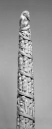 | Keywords: Congolese - Elephant Tusk with Scenes of African life - Walters 71586 - View C.jpg The tusk is carved in high relief with a procession of figures in a rising spiral It is thought to have been carved by the Vili people of Loango for the French traders who dominated the area The scenes which read from the bottom show a war between two African peoples in which the defeated are roped and led away; a sailor woodworking; coconuts being picked; a trader selling gin; prisoners being led off for sale as slaves; a European lighting his cigar; fishermen carrying large fish; a procession of dignitaries; the execution of criminals; goods and ivory being brought for sale; another procession of dignitaries who salute a European in a wicker chair; the preparing of a pig and other food for a banquet; a procession; the arrest of a wrong-doer; a procession; and an execution The top is carved with a gorilla eating a banana and scratching his side The costumes suggest a mid-century date and the Africans in the procession are shown in printed European cotton textiles There are many distinctions in rank among the Africans as indicated by their costume hats and jewelry and by specific symbols for example an umbrella Other similar tusks are known the earliest of which was purchased between 1839 and 1867 by the French admiral Fleuriot de Langle between 1850 1860 ivory cm 108 22 4 10 1 accession number 71 586 10458 Tiffany Company New York date and mode of acquisition unknown Henry Walters Baltimore ca 1910 by purchase Walters Art Museum Henry Walters Acquired by Henry Walters ca 1910 Through African Eyes The European in African Art 1500-Present The Detroit Institute of Arts Detroit; The Nelson-Atkins Museum of Art Kansas City 2010-2011 place of origin Loango Congo Walters Art Museum license Art of the Congo Basin African ivory Collections of the Walters Art Museum Media contributed by the Walters Art Museum needs category review |