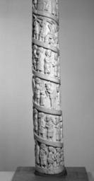 | Keywords: Congolese - Elephant Tusk with Scenes of African life - Walters 71586 - View G.jpg The tusk is carved in high relief with a procession of figures in a rising spiral It is thought to have been carved by the Vili people of Loango for the French traders who dominated the area The scenes which read from the bottom show a war between two African peoples in which the defeated are roped and led away; a sailor woodworking; coconuts being picked; a trader selling gin; prisoners being led off for sale as slaves; a European lighting his cigar; fishermen carrying large fish; a procession of dignitaries; the execution of criminals; goods and ivory being brought for sale; another procession of dignitaries who salute a European in a wicker chair; the preparing of a pig and other food for a banquet; a procession; the arrest of a wrong-doer; a procession; and an execution The top is carved with a gorilla eating a banana and scratching his side The costumes suggest a mid-century date and the Africans in the procession are shown in printed European cotton textiles There are many distinctions in rank among the Africans as indicated by their costume hats and jewelry and by specific symbols for example an umbrella Other similar tusks are known the earliest of which was purchased between 1839 and 1867 by the French admiral Fleuriot de Langle between 1850 1860 ivory cm 108 22 4 10 1 accession number 71 586 10458 Tiffany Company New York date and mode of acquisition unknown Henry Walters Baltimore ca 1910 by purchase Walters Art Museum Henry Walters Acquired by Henry Walters ca 1910 Through African Eyes The European in African Art 1500-Present The Detroit Institute of Arts Detroit; The Nelson-Atkins Museum of Art Kansas City 2010-2011 place of origin Loango Congo Walters Art Museum license Art of the Congo Basin African ivory Collections of the Walters Art Museum Media contributed by the Walters Art Museum needs category review |