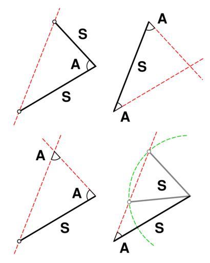 Keywords: Congruent triangles.svg The shape and size of a triangle can be uniquely determined up to congruence by specifying the lengths of two sides and the angle between them SAS or two angles and the side between them ASA Specifying two angles and an adjacent side AAS also works but specifying two sides and an adjacent angle SSA usually gives two different possible solutions This is called the ambiguous case Own 2006-11-27 Ilmari Karonen Other fields + Congruent triangles |