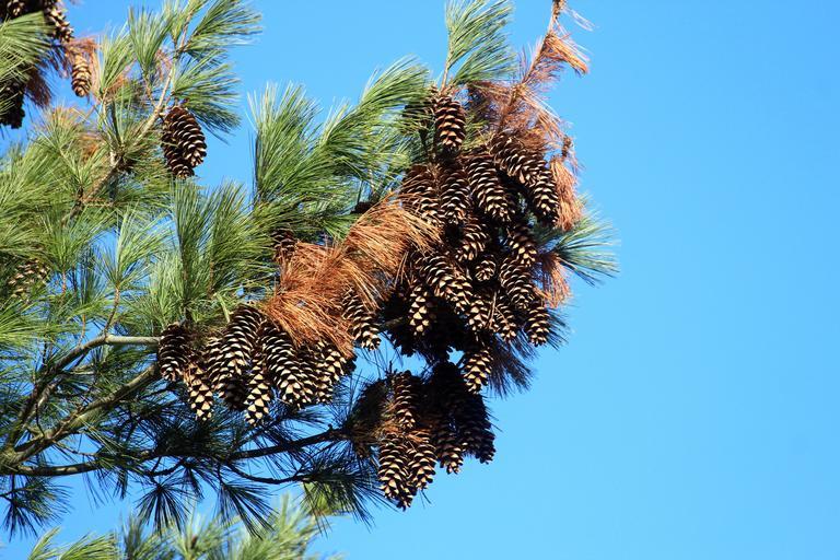 Keywords: conifer pine blue sky tap pine cones tree nature pine needles branch softwood road needles green