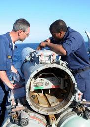 | Keywords: Connecting a Mark 32 surface vessel torpedo tube arming wire.jpg en Gunner's Mate 2nd Class Jordan Simmons shows Chief Gunner's Mate Michael Melton how to connect a Mark 32 surface vessel torpedo tube arming wire aboard the guided-missile destroyer USS Porter DDG 78 Porter is participating in a group sail activity in the Atlantic Ocean to prepare for its role with Destroyer Squadron DESRON 24 in the upcoming Joint Warrior exercise http //www navy mil/view_image asp id 69678 navy mil U S Navy photo by Mass Communication Specialist 3rd Class Joshua Nistas/Released 2009 3 14 PD-USGov-Military-Navy personality rights Aboard USS Porter DDG-78 Mark 32 Surface Vessel Torpedo Tubes Joint Warrior 09-1 |