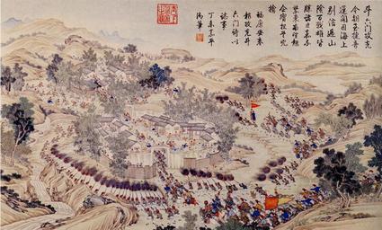 | Keywords: Conquer of Douliumen (Zhuluo).jpg en A scene of the Taiwanese campaign 1787-1788 zh-hans 平定台湾战役之 攻克斗六门 http //www battle-of-qurman com cn/e/hist htm late XVIII century A collaboration between Chinese and European painters The Jesuit missionaries involved in producing the drawings in China were Giuseppe Castiglione Jean-Denis Attiret Ignace Sichelbart and Jean Damascene The engravings were executed in Paris under the direction of Charles-Nicolas Cochin of the Académie Royal at the Court of Louis XVI and the individual engravers include Le Bas Aliamet Prevot Saint-Aubin Masquelier Choffard and Launay PD-Art Military of Qing China Ten Great Campaigns Paintings of the Qing Dynasty |