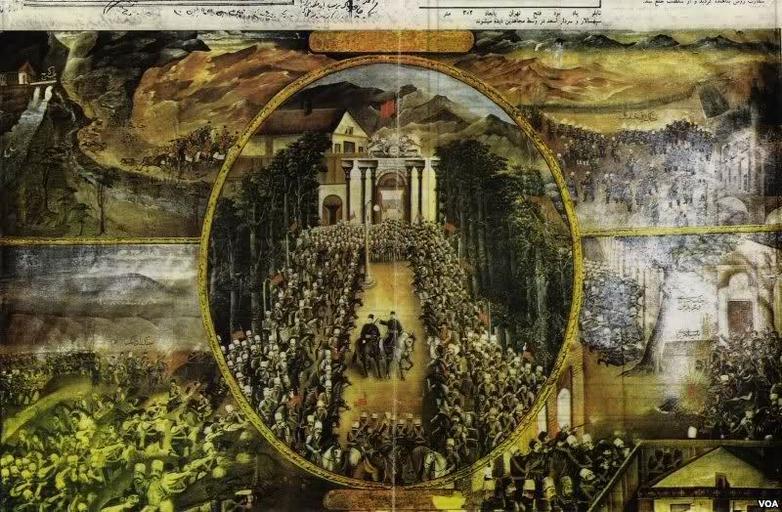 | Keywords: Conquerors of Tehran (Constitutional Movement).jpg fa تابلوی پنجگانه «فاتحین تهران» که امروزه در کاخ صاحبقرانیه جای گرفته است ، این تابلو به شيوه روايتي مرسوم زمانه رخدادهای این جنبش اجتماعی را روایت کرده است date http //gdb voanews com/754F5EC2-39C2-4439-B5E1-C77E2221677F_mw1024_n_s jpg voanews com author PD-USGov Uploaded with UploadWizard Qajar art Constitutional Revolution Iran Sardar Assad | ||||